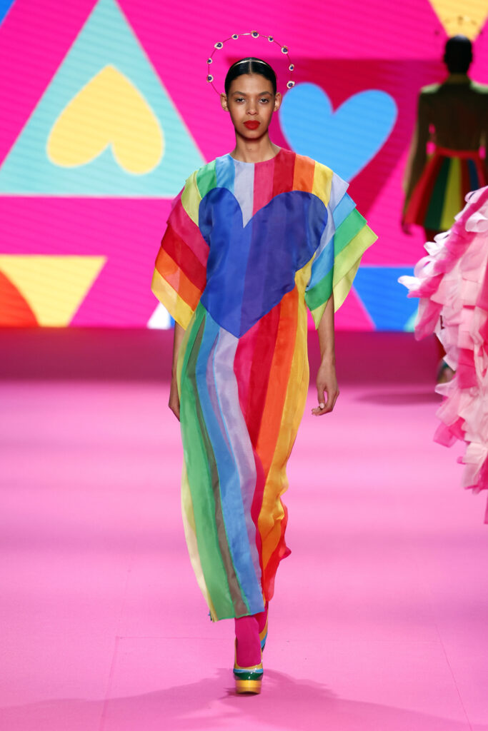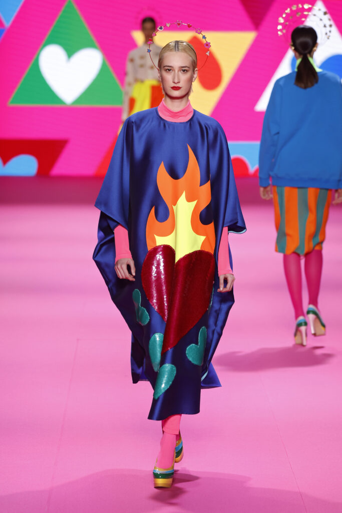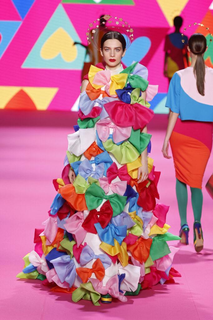 Los icónicos clásicos de la marca, el corazón, la flor y la estrella también se unirán a la pasarela, entre rayas multicolores, dibujos geométricos y matices de grafiti. Como siempre, nada será lo que uno espera, por mucho que se recuperen diseños históricos de la marca, como el chaleco agathísta tan aclamado en los años 80, o el vestido gallo, formado con pequeños trocitos de tela reciclados. El vestido gallo se verá sublimado en una apoteosis de tiras de organza de colores superpuestas con la infinita paciencia de sus modistas, quien también han apostado por vestidos Rothko en telas transparente y en lentejuelas, a la vez que en juegos con lazos de organza en distintos tamaños para las agathístas más refinadas.