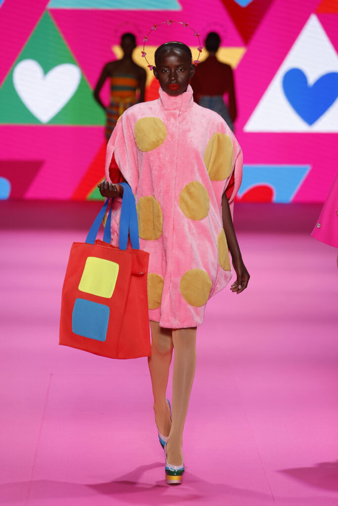 Los lunares pronto se apoderarán del desfile, apareciendo en estampados de algodón entre sus prendas comerciales y en polipiel de peluche, en polipiel acolchada, en neoprenos de color neón, en popelín, en algodón, en jersey de algodón y en pana entre sus prendas de taller, aquí incluso llegaran a envalentonarse y a coger volumen, convirtiéndose en bolitas de colores bordadas sobre algunas prendas. Uno de los abrigos de polipiel de peluche es directamente un lunar gigantesco, andante sobre las patitas del portador del abrigo.