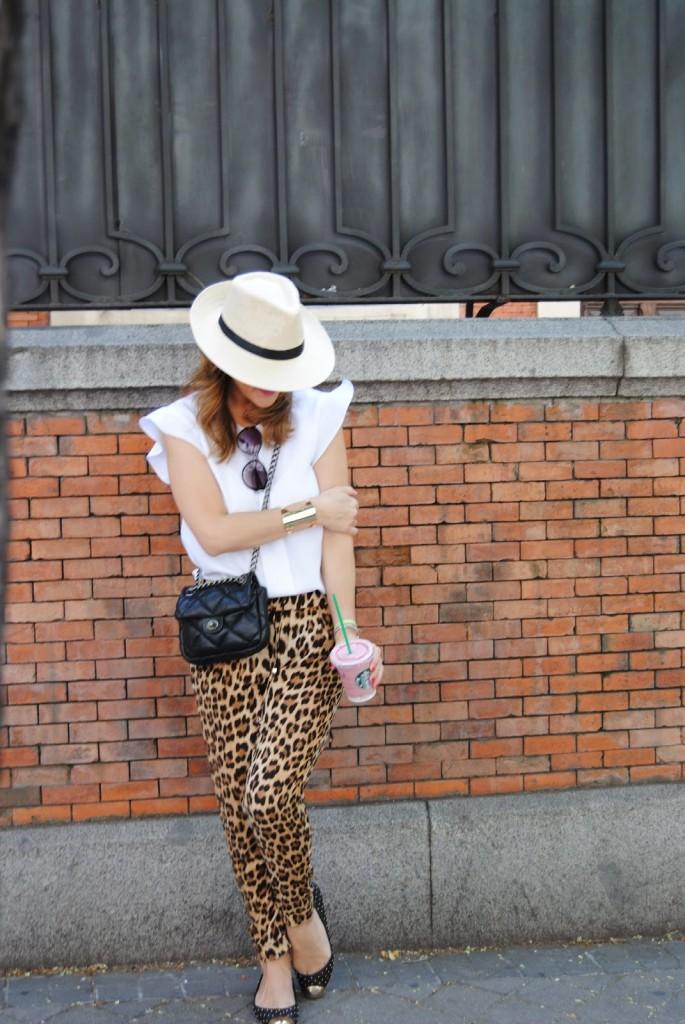 Puede parecer de primeras una combinación muy rara pero de verdad probarla porque os sorprenderéis. Yo en este caso lo combiné con camisa blanca pero una negra también hubiera estado bien. Me gusta que un look tan “agresivo” ilumine la cara por eso he escogido el blanco. Lo llevo con un bolso de Bimba y Lola en negro acolchado, un clásico que no pasa de moda, que tiene unos cuantos años pero en tienda siempre hay, como los de Purificación García. Son una especie de Coco Chanel salvando grandes diferencias es obvio… La pulsera es un regalo que me hizo una amiga por mi cumpleaños. Poco a poco iré sacando todo lo que me regalaron los amigos… ¡No doy a basto! Y todo me encantó. Esta es de Mango Touch y también es todo un acierto porque los complementos en oro me encantan y me parecen súper elegantes. El sombrero de un mercadillo y las manoletinas de Carpe Diem. Por cierto ¿habéis probado los nuevos frapuccinos del Starbucks? Este de frutas del bosque que probé ayer está rico pero creo que me quedo con mi frapuccino de crema caramelo.