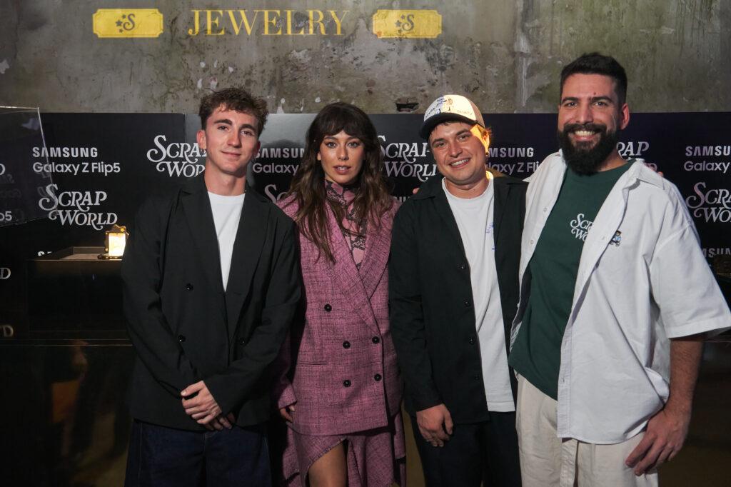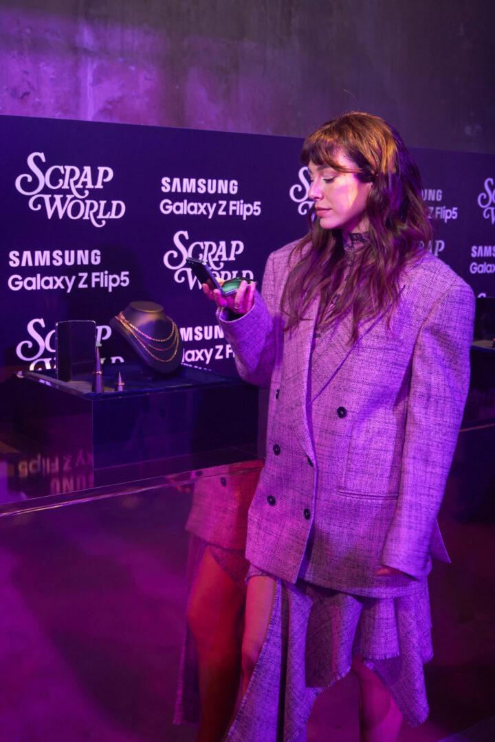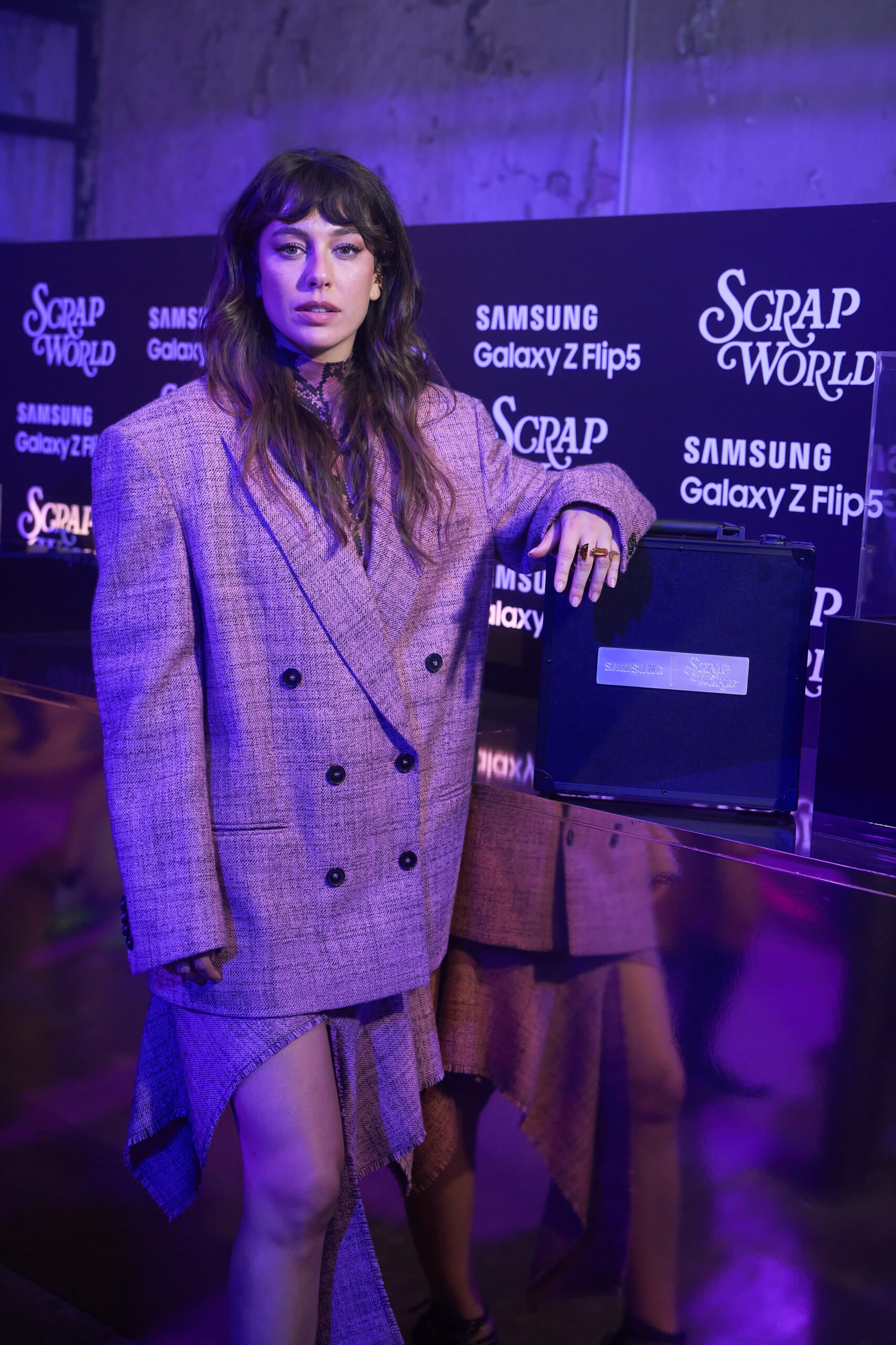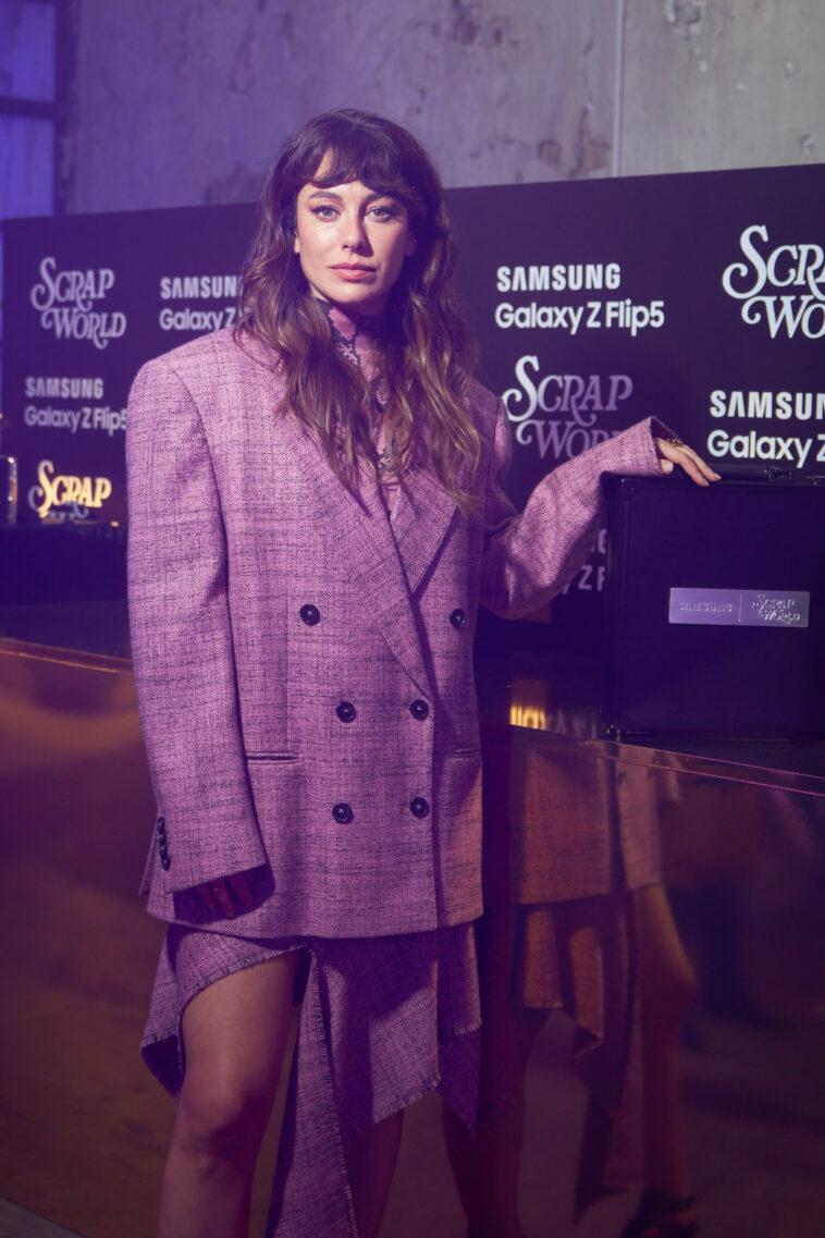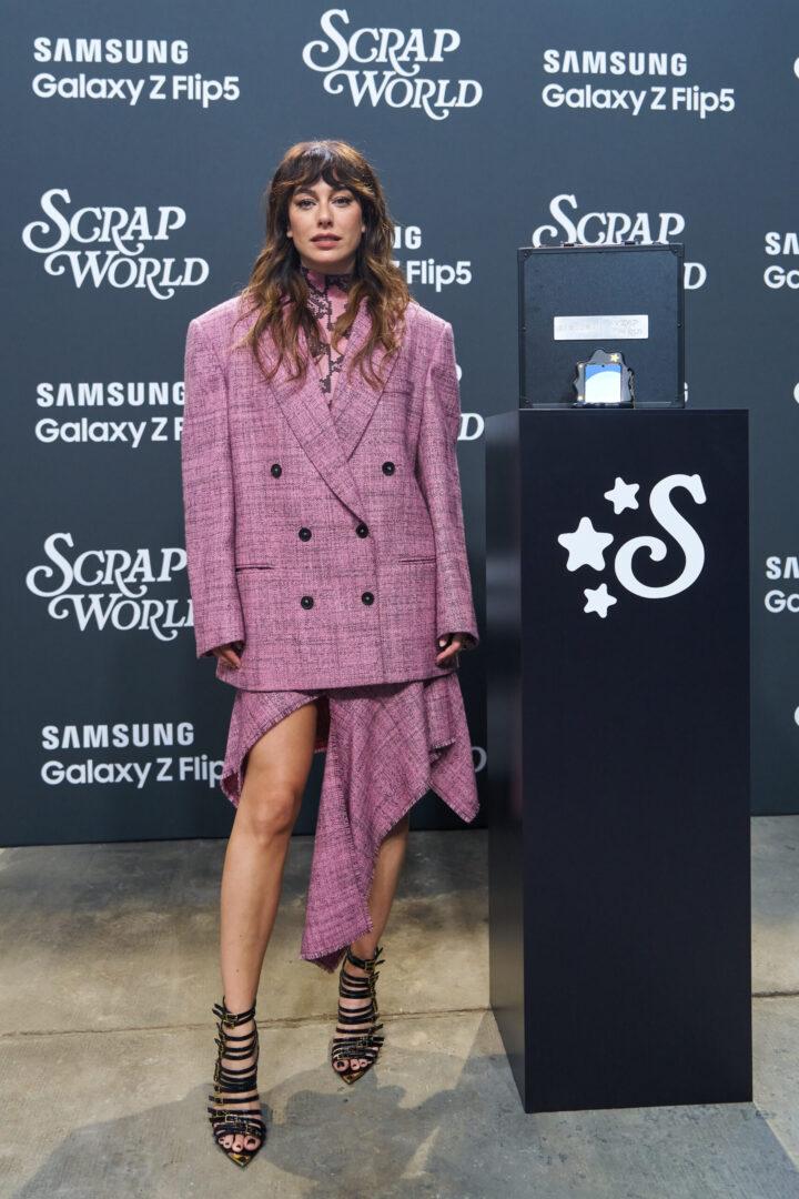 Samsung y una edición exclusiva de su nuevo móvil plegable Samsung Galaxy Z Flip5 en colaboración con ScrapWorld, están detrás de la última aparición de la actriz. En el Museo La Neomudéjar, un centro de artes de vanguardia, Blanca llegaba con un look que parecía hecho a medida para la ubicación. Firmado por Stella McCartney, estaba compuesto por un top de cuello perkins con estampado de serpiente, una blazer ‘oversize’ y falda desestructurada, un ‘total look’ en tweed color púrpura que combinaba con unas sandalias repletas de tiras negras de Giuseppe Zanotti.