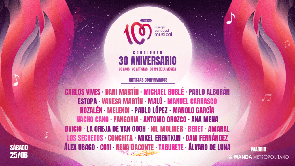 Cuatro horas de buena música y sorpresas durante un evento que reunirá en un mismo lugar a los oyentes y a esos artistas que han puesto letra y música a estas tres últimas décadas. De este modo, y a lo largo de estos meses, CADENA 100 ha ido confirmando el resto de nombres: Vanesa Martín, Pablo López, Melendi, Pablo Alborán, Malú, Nacho Cano, Manuel Carrasco, Dani Martín, La Oreja de Van Gogh, Fangoria, Amaral, Beret, Manolo García, Rozalén, Álvaro de Luna, Nil Moliner, Ana Mena, Estopa, Carlos Vives, Mikel Erentxun, Álex Ubago, Nena Daconte, Dvicio, Antonio Orozco, Los Secretos, Coti, Dani Fernández, y Taburete que junto con el anuncio de Conchita esta misma mañana, componen el cartel de los 30 “números 1” de la música.