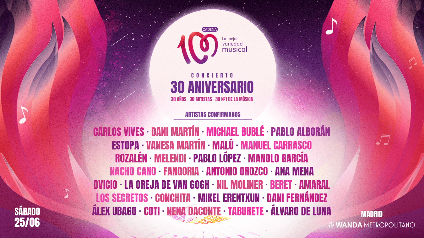 CADENA 100 celebrará el sábado 25 de junio de 2022 treinta años de historia junto a sus oyentes. Lo hará en un concierto sin precedentes y en un escenario de lujo: el Estadio Wanda Metropolitano.