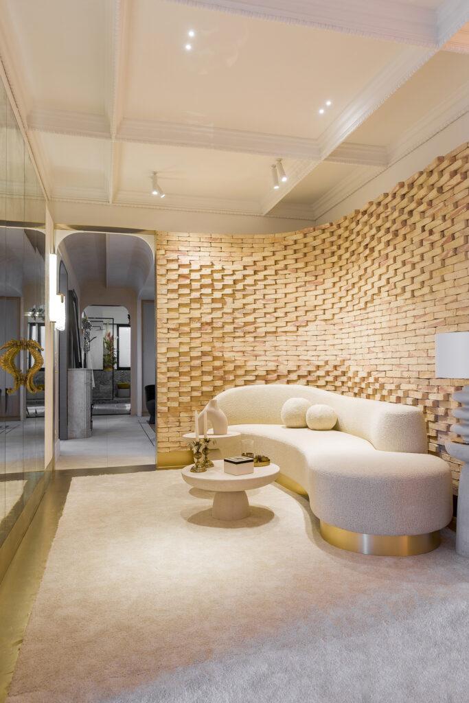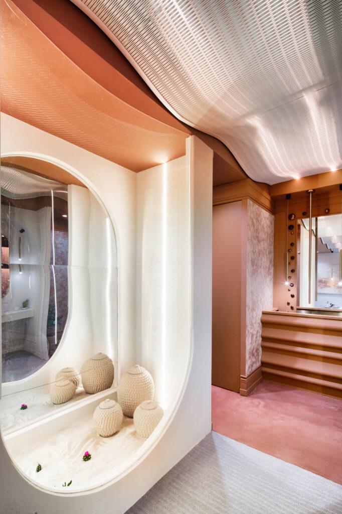 Se acentúa la utilización de materiales minerales para el revestimiento de las paredes y el diseño de mobiliario, con acabados metalizados y cobrizos que afloran a la superficie. El aspecto brutalista del cemento se suaviza con interiorismos cálidos y envolventes, creando un efecto ecléctico que navega entre lo industrial y la más alta sofisticación. Las formas redondeadas, un recurso muy utilizado en los diseños de los últimos años, están presentes en paredes de sinuosas ondulaciones, en muros sin aristas, arcos de medio punto, asientos curvos, mesitas circulares o de óvalos irregulares. El efecto roundlo abarca todo.