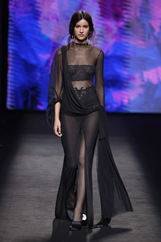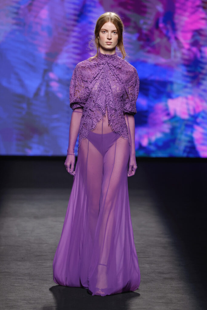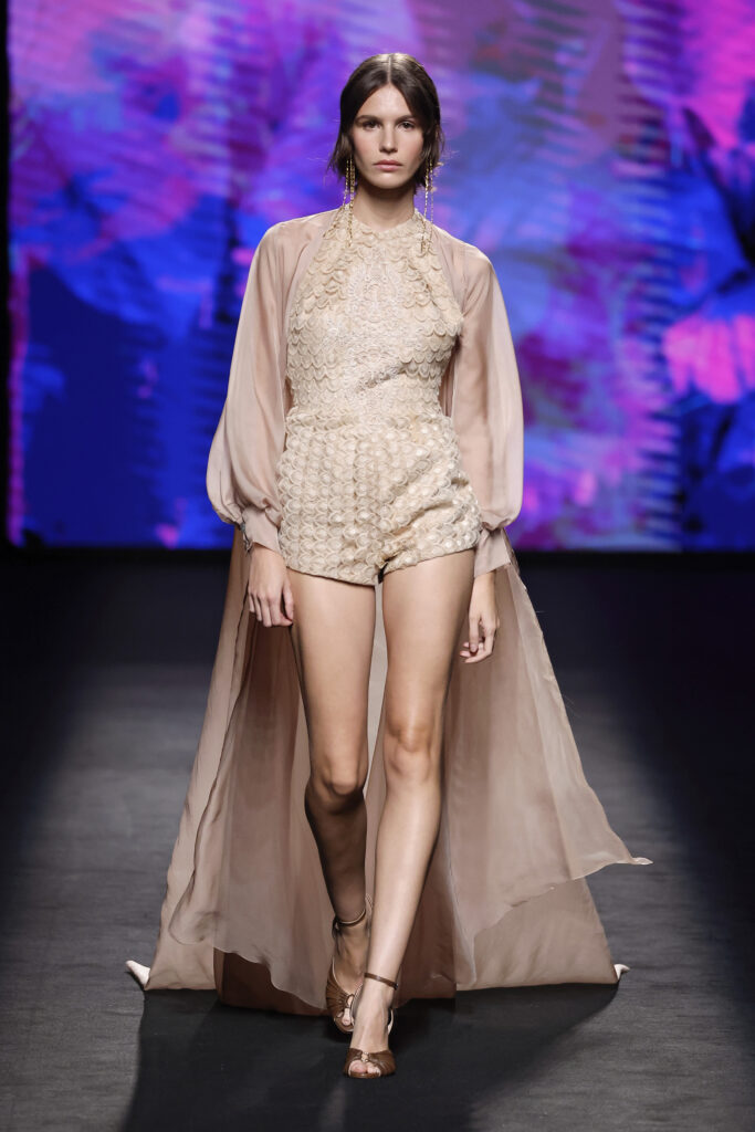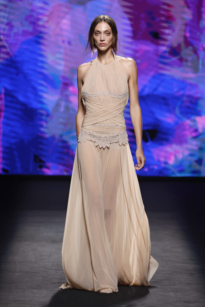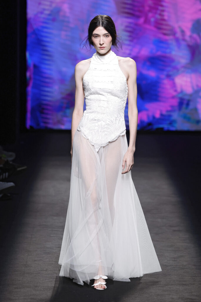 Claro Couture ha desfilado en el primer día de Madrid Fashion Week en su 80 edición. Ha sido el último en hacerlo y ha recibido los mayores aplausos del día. Los encajes delicados, las transparencias estratégicas y los corsés ajustados realzan la silueta femenina, mientras que la superposición de tejidos fluidos y lujosos, como gasas y tules de seda, aportan profundidad y movimiento a cada diseño. Combinado con labores artesanales, pedrería o lazos que evocan una estética coquette.