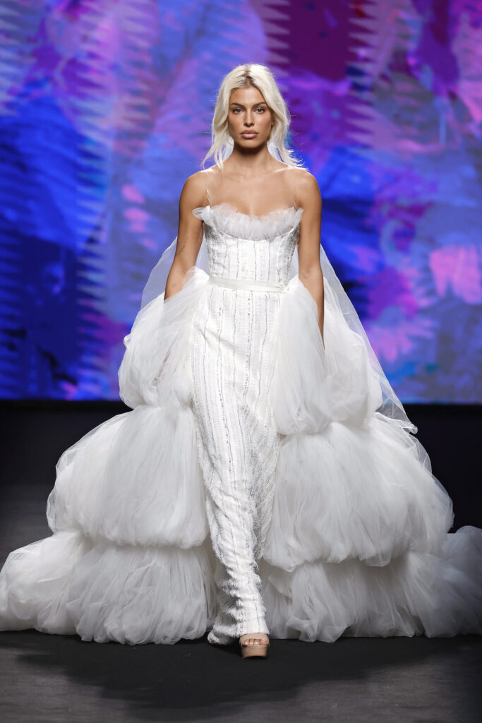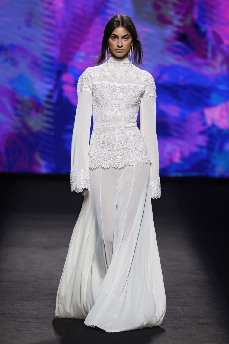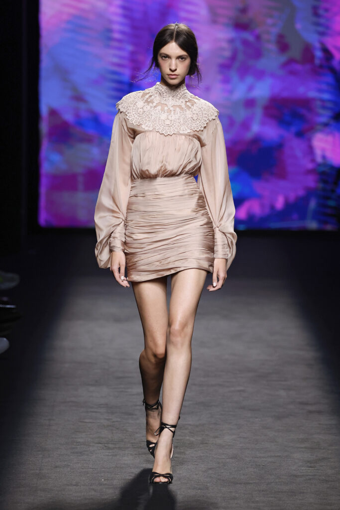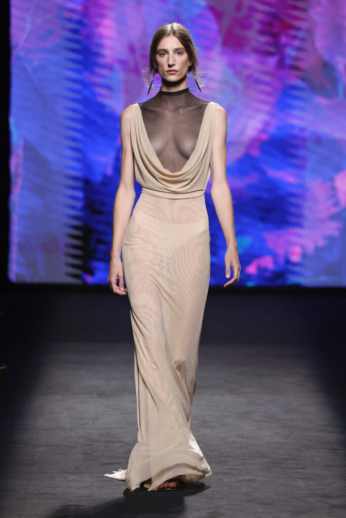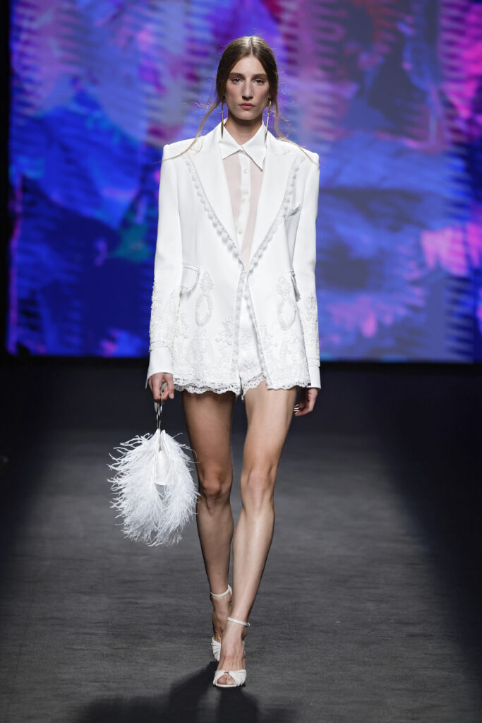 Claro Couture ha desfilado en el primer día de Madrid Fashion Week en su 80 edición. Ha sido el último en hacerlo y ha recibido los mayores aplausos del día. Los encajes delicados, las transparencias estratégicas y los corsés ajustados realzan la silueta femenina, mientras que la superposición de tejidos fluidos y lujosos, como gasas y tules de seda, aportan profundidad y movimiento a cada diseño. Combinado con labores artesanales, pedrería o lazos que evocan una estética coquette.