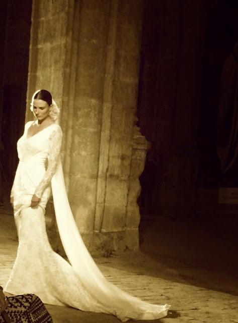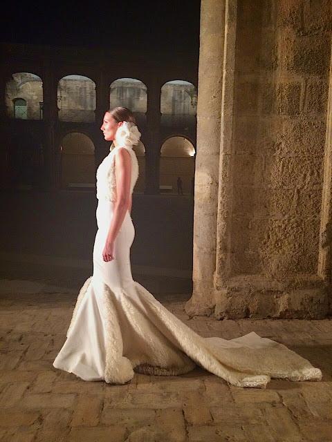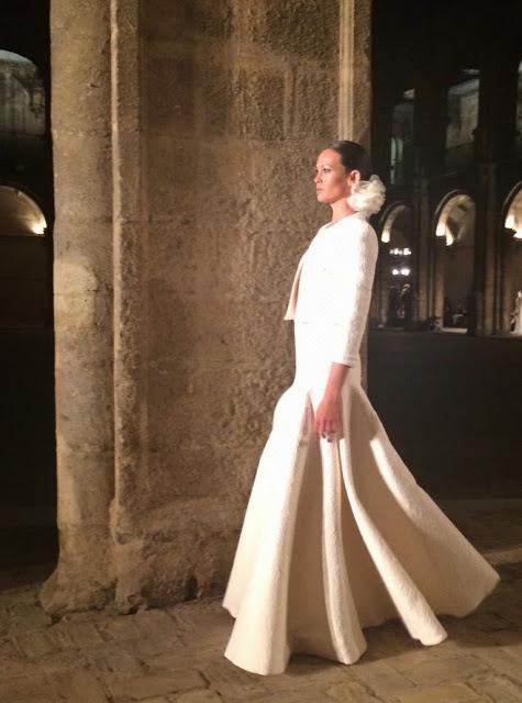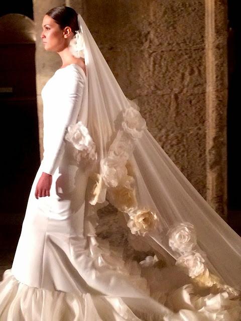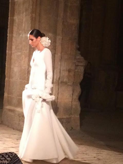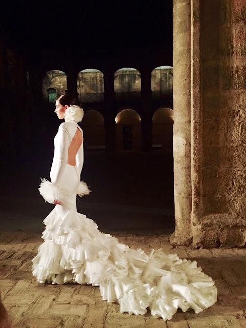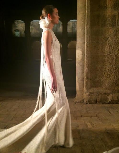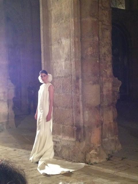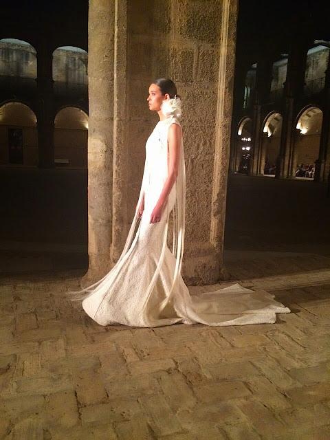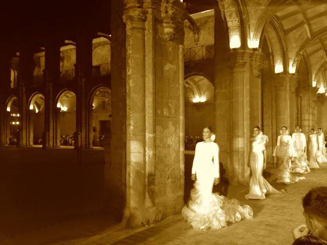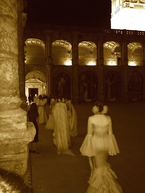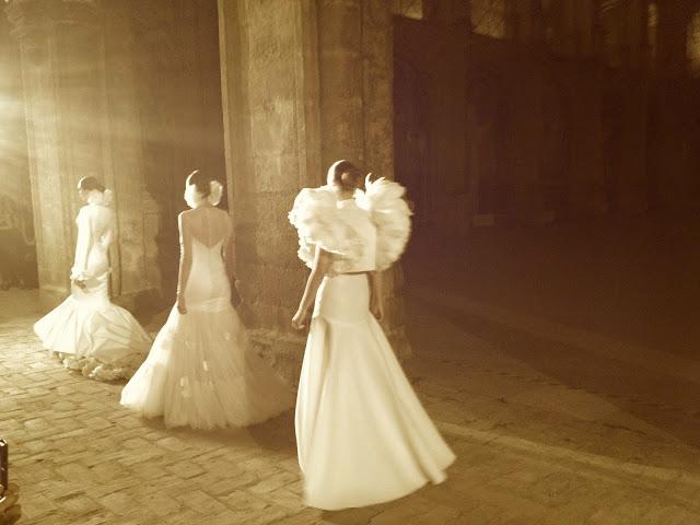 En un lugar de cuento, en el Monasterio de San Jerónimo a las nueve y media de la noche, se celebró el desfile de novia y madrina de Vicky Martín Berrocal. Ni en los mejores rezos ni en las más profundas suplicas esos monjes imaginaron algo así. Os tengo que decir que cuando voy a los desfiles de Vicky Martín Berrocal se produce en mí como una especie de catarsis. En una vida llena de prisas y ruido, el aire se me hace más puro que en cualquier otro lugar. Es al único desfile que siempre voy con pañuelo en mano porque sé que no es una sucesión de trajes, es moda que te revuelve por dentro, desnuda lo más profundo de ti y tu alma viaja en vía libre. Si a todo eso le sumas una música perfectamente elegida te darás cuenta que la imaginación es más rápida que la vida. No os voy a hablar de lo perfecta que es en la ejecución porque me parece una cosa tan obvia que no tiene sentido.