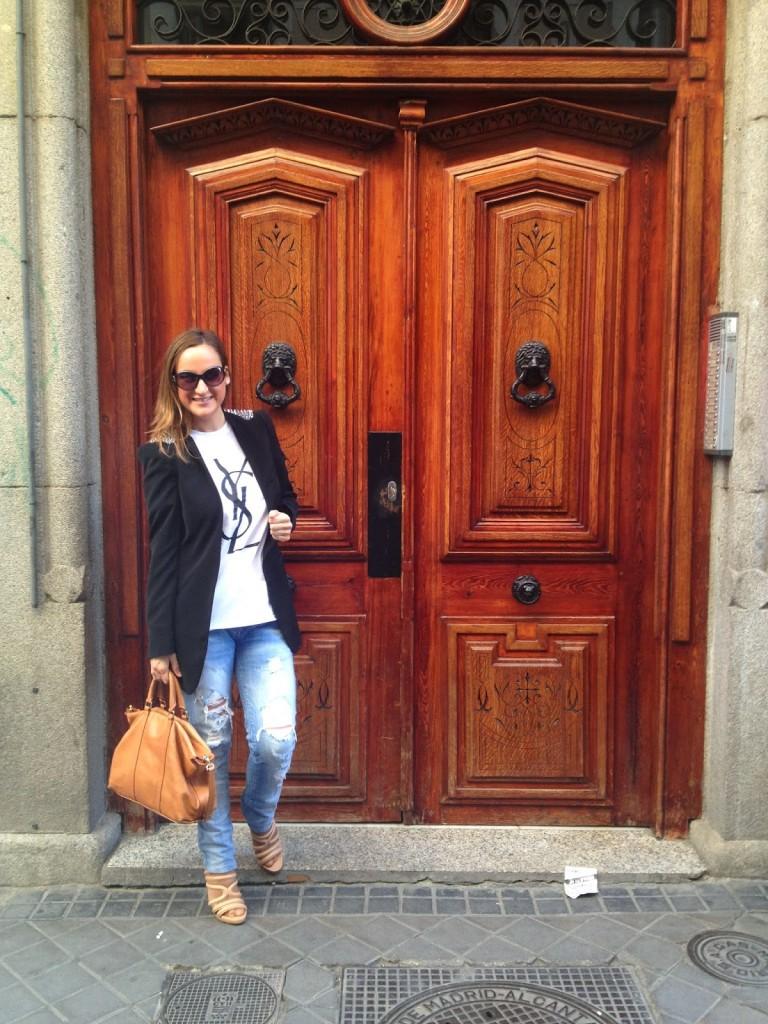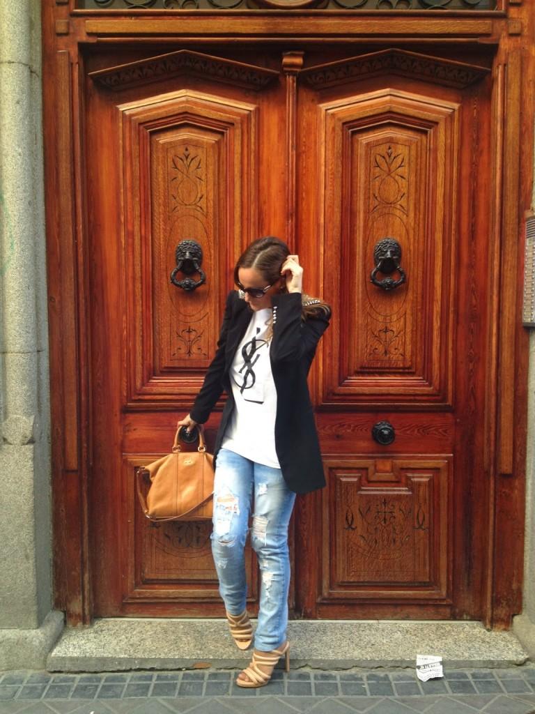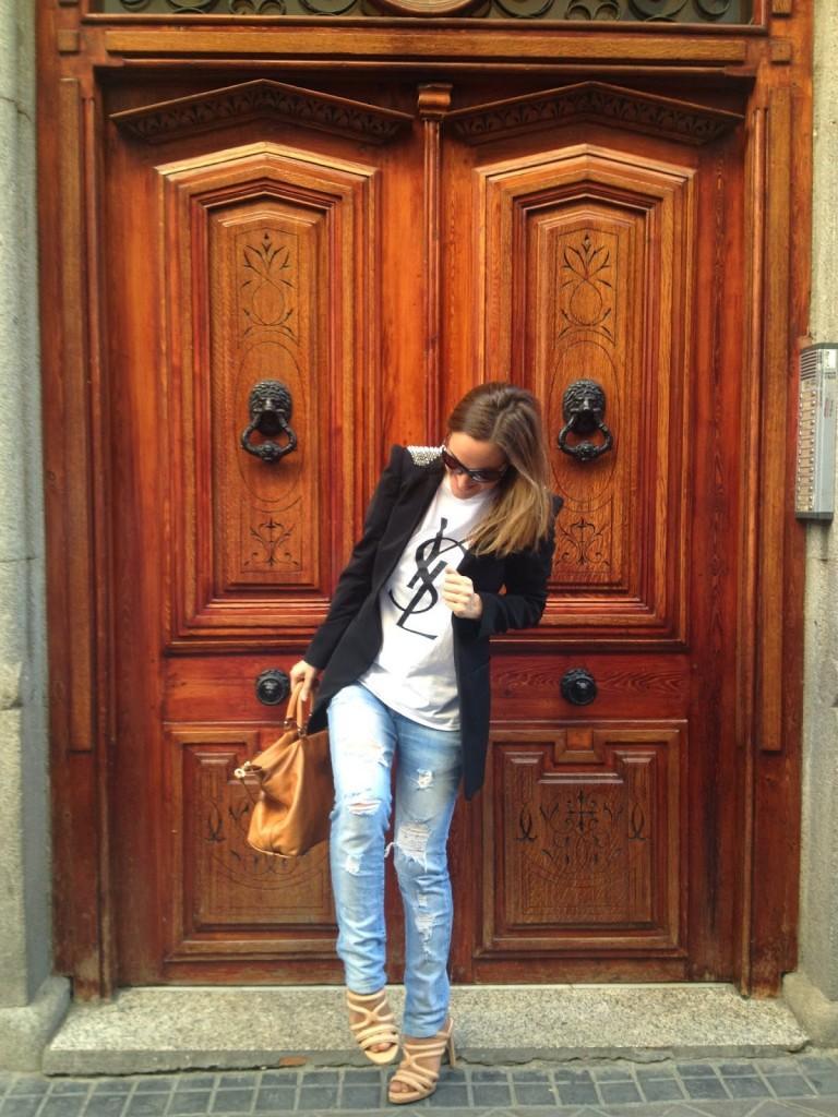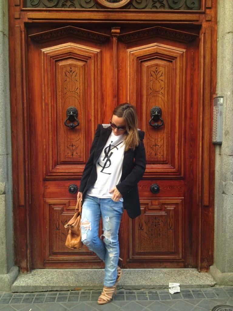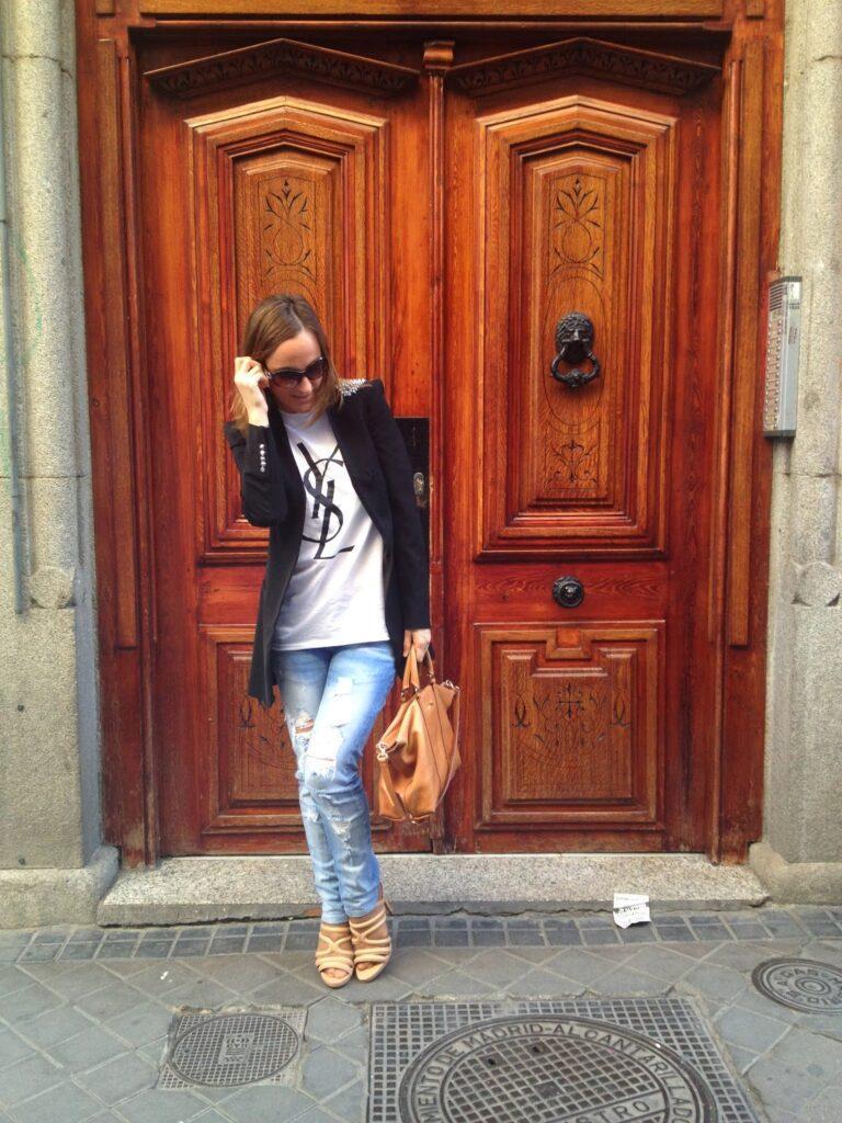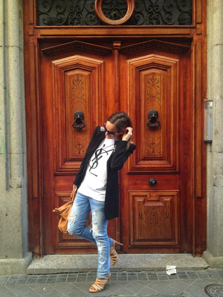 En fin, una parte más divertida porque la vida también está para darle la vuelta y tomarse las cosas con humor. Hoy hasta aquí os traigo algo parecido peeeeero no igual. No pone ninguna frase diferente ni nada pero sí la veo muy copia a un posible eslogan. La gente tiene mucha imaginación y en este país si algo tenemos es que nos reímos hasta de nuestra sombra. Poco más que contaos hoy, salvo que he llegado a casa medio moribunda con esos tacones que veis en la foto. Las sandalias son bonitas a morir pero la que no esté acostumbrada a tacones que no se los compre y la que sí…que resista como yo. Porque para presumir a veces sí hay que sufrir. Todo no se puede tener. Llevo camiseta de Velvet, sí como la serie, jeans de Zara. bolso Bimba y Lola y sandalias o andamios como prefiráis de Zara. Mil besos en el corazón, mañana más.