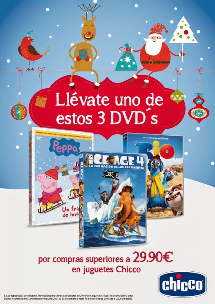 Más técnicamente os diré que aparte de ayudar al niño a estar de pie y dar sus primeros pasos con seguridad, el juguete enseguida comienza a tocar un divertido twist que se interrumpe si el bebé se detiene para animarlo a seguir caminando. También es un centro de actividades con muchos juegos divertidos de luces y efectos sonoros. Está valorado en casi 50 euros, es a partir de los 9 meses y quiero que sepáis que si compráis juguetes Chicco estas Navidades por compras superiores a 29,90 Euros os lleváis uno de los tres DVD’s que os muestro en la última foto. Os dejo la web para que veáis todas las cosas bonitas y especiales que tienen para regalar en Navidad…