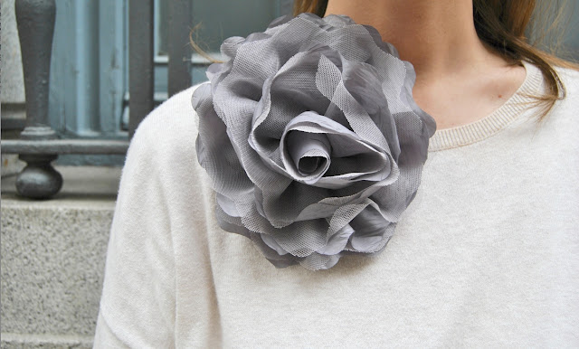 En fin que no queda otra que abrigarse y que nadie más salga por la tele diciendo que le pilló desprevenido por favor que estamos en unas fechas que ver bikinis sólo los periodistas de prensa en showrooms y poco más. Ayer vi unos que casi se me caían los lagrimones pero ya sabéis que si hablamos de estilo mi estación favorita es el invierno. No se puede comparar en cuanto a elegancia. Ese es mi punto de vista. Pero volviendo a la bienvenida que le he dado al frío polar es diré que hace muchísimo tiempo que buscaba una flor como la que llevo. La vi buscando unos looks de Street Style de los que os enseño por aquí y me volví loca pensando lo bonita que podría quedar para una camiseta de rayas marineras. Como el tiempo se me ha pasado para el outfit que tenía pensado he decidido improvisar. No era fácil buscar una flor a mí gusto. Siempre veía mil y eran todas bastante feas y poco logradas. Llegué a ir a un vivero a ver lo que tenían de flor seca pero nada. Ninguna me parecía elegante y bonita, francamente eran muy catetas, hablando claro eran muy del chino todas la que vi y creedme que vi muchas.