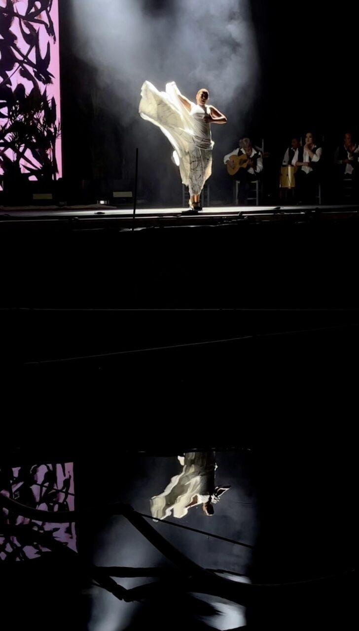 Tienes razón, yo toda la vida he pensado que en el momento que fuese mamá ya no sería tan fuerte, que no podría aguantar dos horas a tope, arriba, con velocidad y frenazos… y sin embargo si te cuidas, si te cuidas pero normal, yo no soy esclava, no vivo esclava para el baile pero sí tengo un entrenador que me ayuda a que no me lesione, sí como bien, sí duermo bien, sí tengo alrededor gente que me ayuda, sí tenemos los valores de equipo muy presentes y eso es lo que hace que entre todos podamos porque sino no puedes. Si descontrolas un poco ya no puedes llegar a esas velocidades y encima sentirlo y compartirlo y además por eso decía la parte emocional también está muy dentro, no es algo que hagas matemáticas, es algo que tú tienes que sentir para poder expresar todo eso, lo tienes que sentir sino no vale, entonces el desgaste físico y psíquico la verdad que es fuerte pero bueno yo la verdad es que estoy muy sorprendida con eso porque cumplo más años y más fuerte me veo, es energía por eso te digo nunca hay palabras suficientes para agradecerle al público pero es que es verdad, el público responde y esa energía te la manda de una manera que te vas convirtiendo en algo súper bonito de fuerza hablando. Yo soy una enamorada del flamenco, del teatro y de todo… pero bueno, es muy importante rodearte de gente que te ayude sino no habría manera.