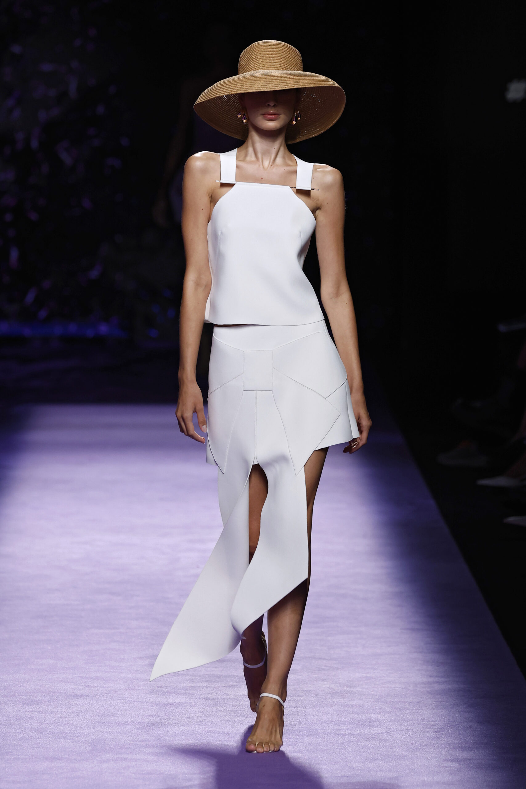 La nueva colección para el próximo verano 2025 de Isabel Sanchís está inspirada en la escultura. Podemos ver una colección femenina y poderosa, con siluetas de volúmenes puros y geométricos. Aparecen flores, corbatas y lazos con efecto trepanado sobre mini vestidos, abrigos y vestidos más imponentes que juegan con plisados realizados con tejidos que simulan un jarrón de cerámica.