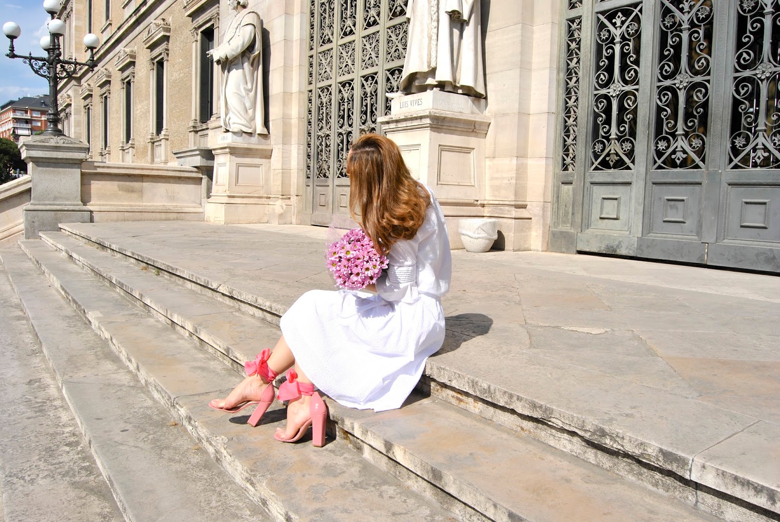 ¡Buenos días! Sí… ¡Hoy es mi cumpleaños! Y qué mejor que celebrarlo cumpliendo sueños. Hace muchos años que me apetecía hacer unas fotos en las escaleras de la Biblioteca Nacional de Madrid. Cada vez que paso por allí me parece un sitio mágico lleno de solemnidad y por supuesto muchas historias. Es un sitio que enamora por su belleza y siempre soñé con un pequeño shooting en sus escaleras. El otro día y aprovechando que había poca gente mi amiga Eva cámara en mano me dijo que me haría unos fotos allí algo más especiales por ser el día de mi cumpleaños. Así que a primera hora de la mañana me fui a por flores frescas, elegí modelito y nos plantamos en medio de mi sueño. Esta es la famosa segunda parte de “The 2nd Skin and Co por Manoletinos”.