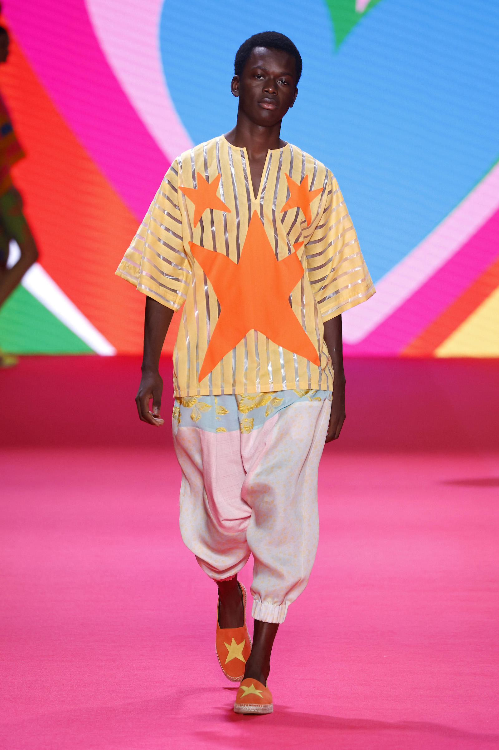 También vuelven a la pasarela los hombres, con 4 looks “agatho-afro-futuristas”, jugando con patrones de pantalones bombachos y camisas oversize.