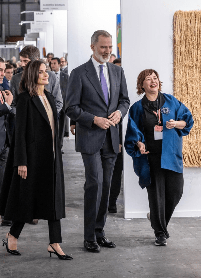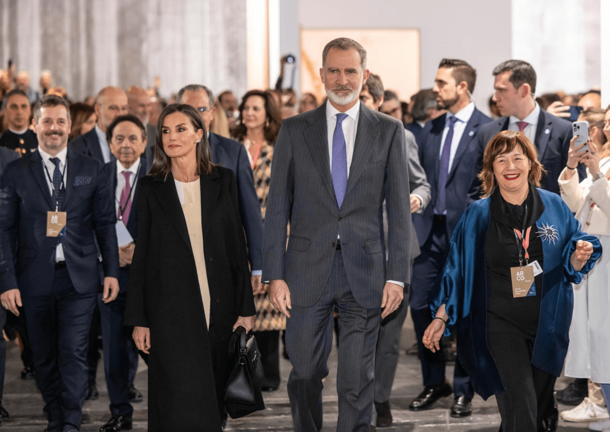 La reina Letizia ha llegado a ARCO con un look sencillo y minimalista en clave working compuesto de abrigo negro, del que no ha prescindido de el en todo el recorrido, pantalones tobilleros del mismo tono, zapatos destalonados y la sorpresa más destacada es la camisa efecto 3D de la marca española Adolfo Domínguez. Como complementos, su fiel bolso de Carolina Herrera que posee en varios colores, esta vez acompañando la gama cromática del look también en tono oscuro. Un mensaje sobrio quizá acontecido por los últimos hechos en la familia del monarca. Sutil y elegante, en su siempre alabado estilo.