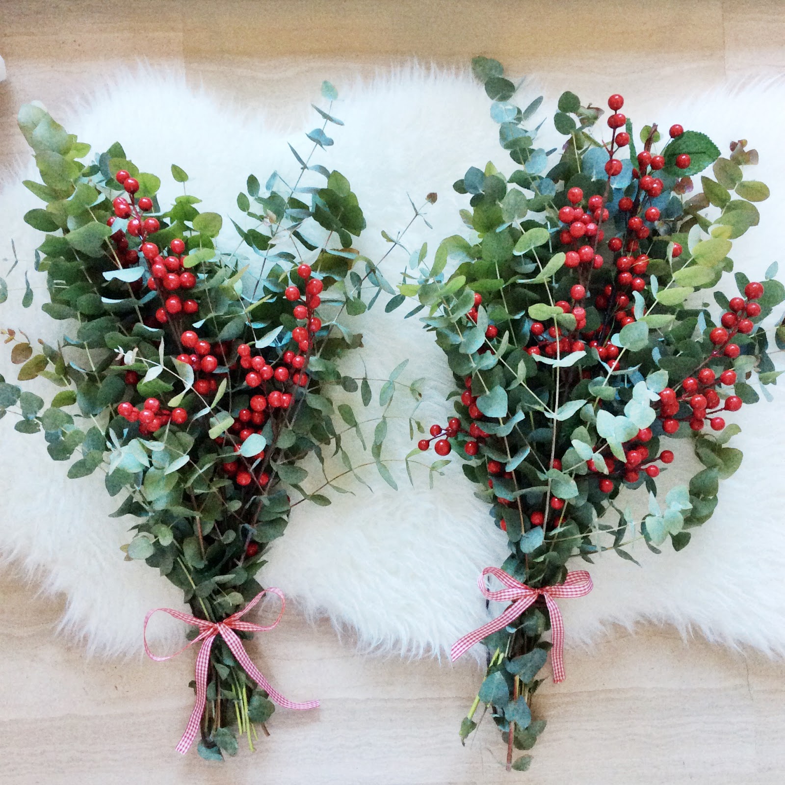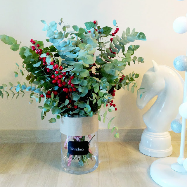 Flores de Navidad: Este fin de semana “agarré” a Papa Noel por banda y le canté las cuarenta. Este año no se me escapa ya que siempre le deja todo el trabajo a los Reyes. Locuras a parte tengo que decir que ya me metí de lleno con la decoración navideña en casa. Para empezar hice estos ramos que han causado sensación de eucalipto y acebo. Este año me encargo también de la decoración de mi urbanización ¿Huyo? O la decoro a lo grande… Estoy en esos dos extremos.