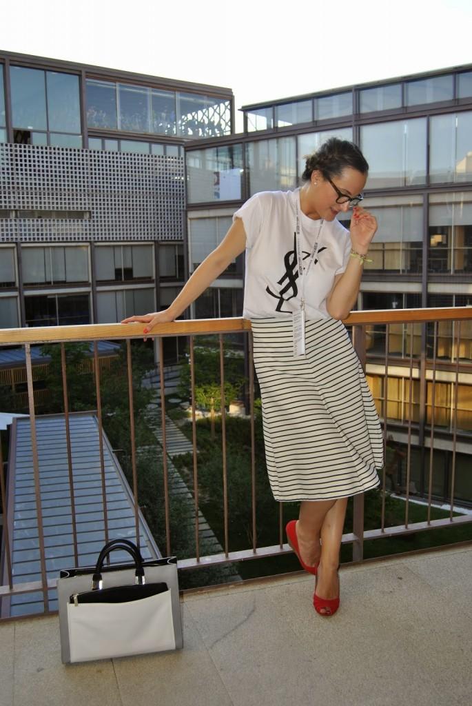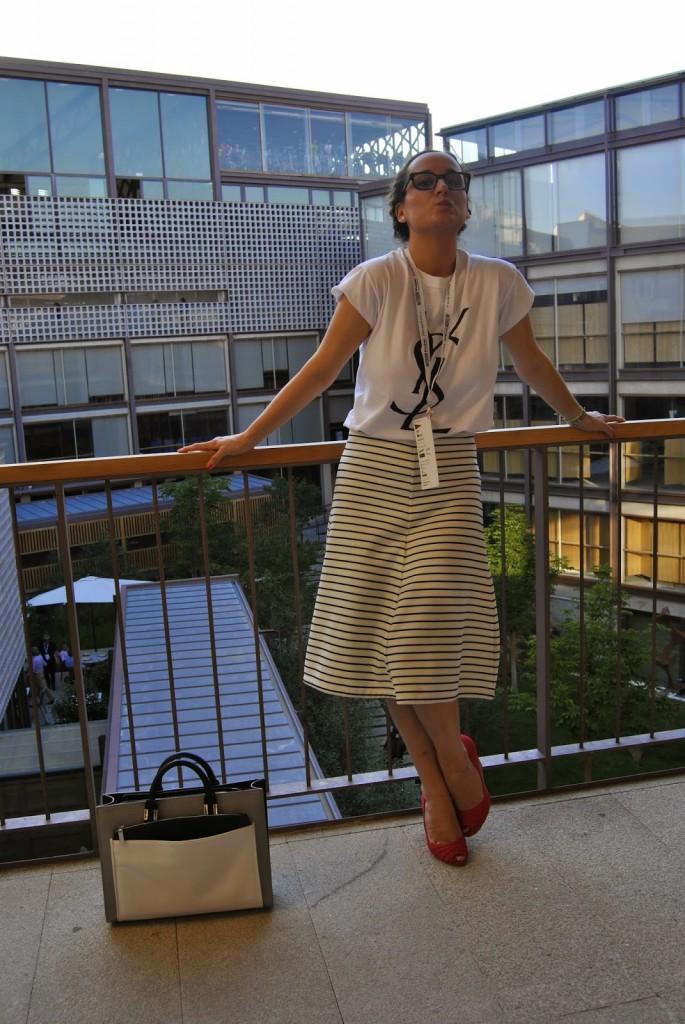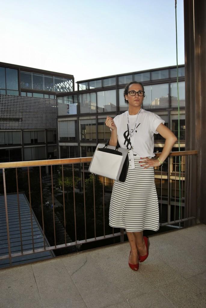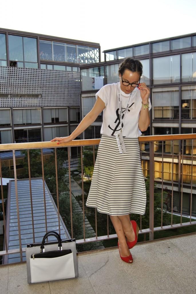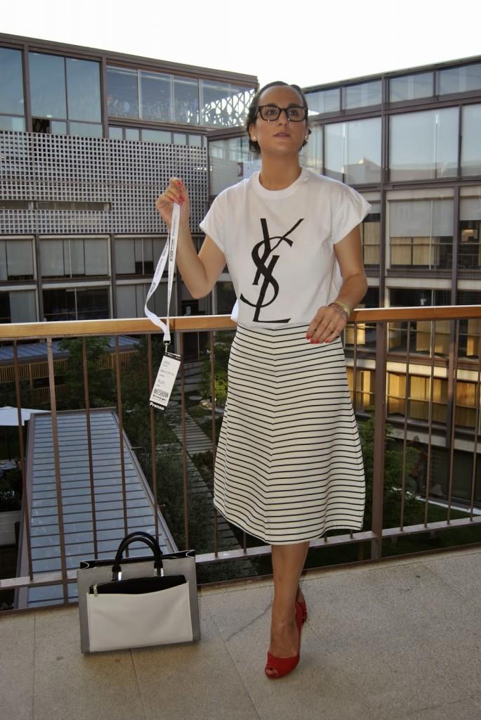 No sé si mejor o peor, a mi me pareció que vestirme así en ese momento me encantaba. Últimos desfiles de MFSMen en el Colegio de Arquitectos de Madrid, un edificio precioso… Esto es lo que os comentaba el otro día, hay veces que te apetece variar, salir del rol de todos los días y arriesgar un poco más. Ser diferente pero dentro de tu personalidad. No es muy común verme así pero os prometo que ese día me sentía genial con la ropa aunque tuviera que elegirla en medio minuto. Fue mi tercer cambio de ropa y a veces la cabeza ya no da para más con tanto estilismo. Llevo unas trenzas de raíz que desde que me enseñaron a hacerlas, me libra de realizar un peinado algo más sofisticado sin pasar por la peluquería. ¿No lo veis un poco Pin Up? Tal vez sí… Lo llevo con una camiseta fake tan de moda últimamente de Yves Sant Laurent, falda midi de rayas marineras de Zara y cuñas de Stradivarius. Mil besos en el corazón, os espero el lunes por aquí.