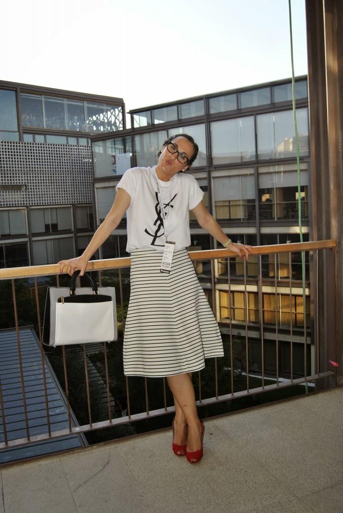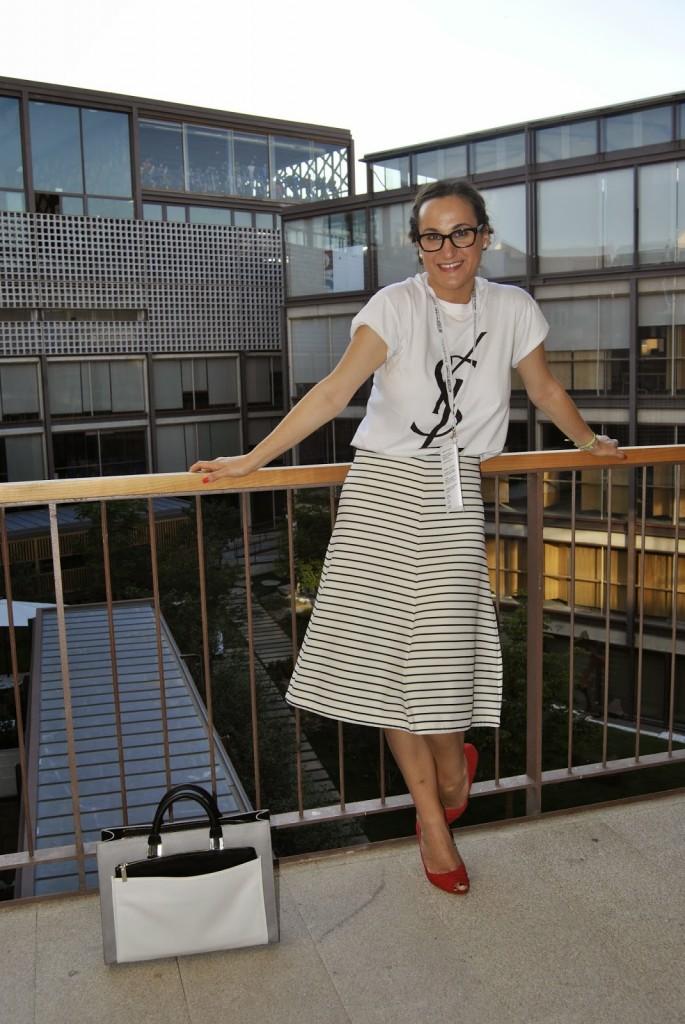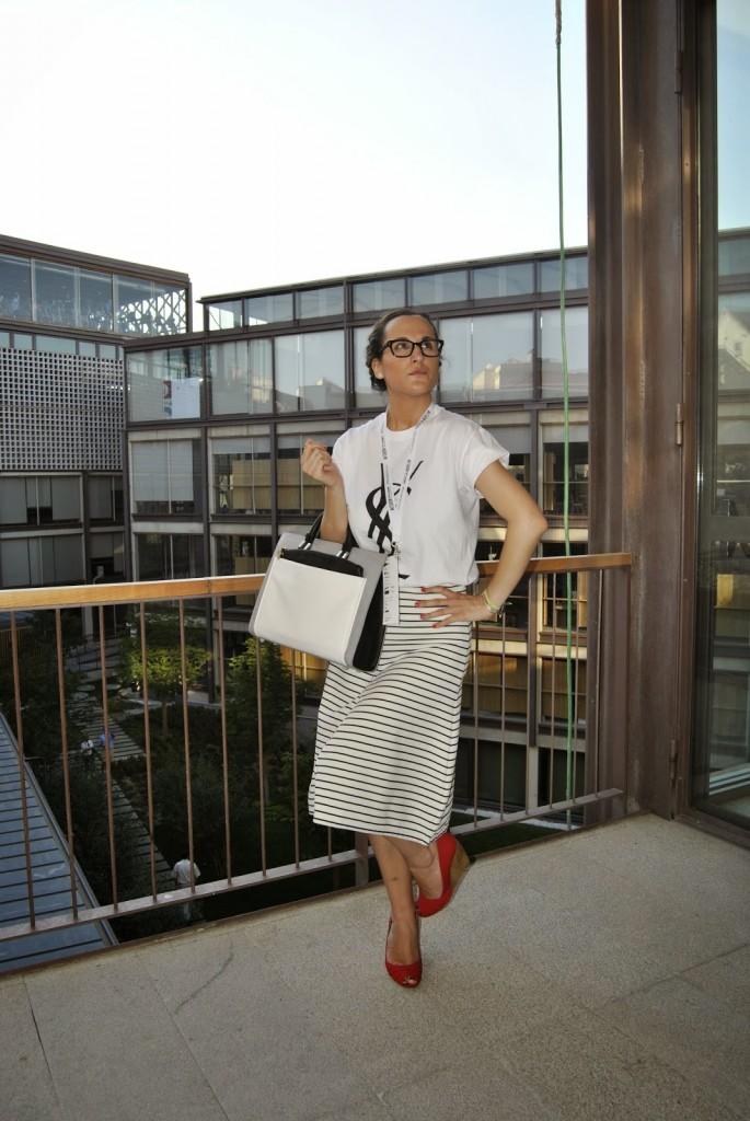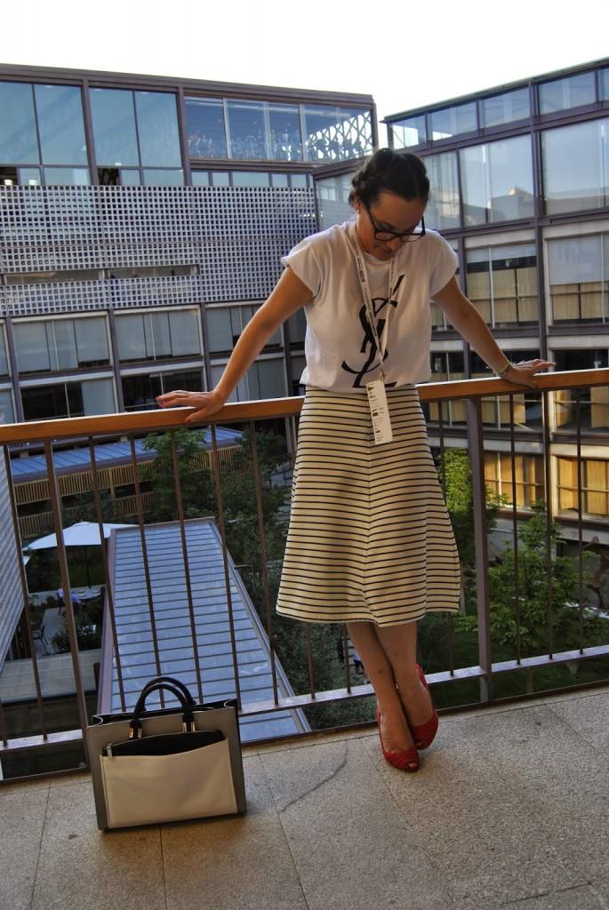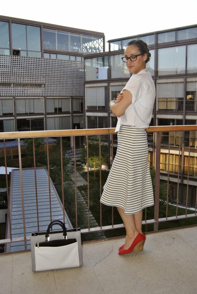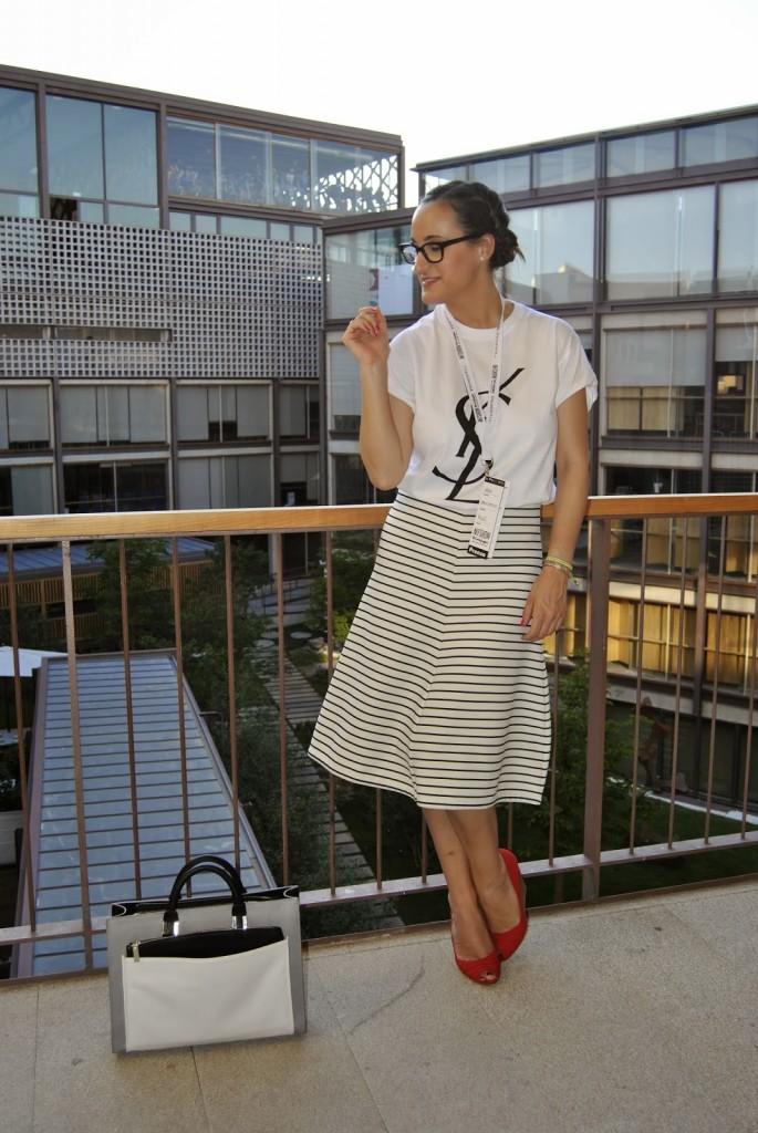 No sé si mejor o peor, a mi me pareció que vestirme así en ese momento me encantaba. Últimos desfiles de MFSMen en el Colegio de Arquitectos de Madrid, un edificio precioso… Esto es lo que os comentaba el otro día, hay veces que te apetece variar, salir del rol de todos los días y arriesgar un poco más. Ser diferente pero dentro de tu personalidad. No es muy común verme así pero os prometo que ese día me sentía genial con la ropa aunque tuviera que elegirla en medio minuto. Fue mi tercer cambio de ropa y a veces la cabeza ya no da para más con tanto estilismo. Llevo unas trenzas de raíz que desde que me enseñaron a hacerlas, me libra de realizar un peinado algo más sofisticado sin pasar por la peluquería. ¿No lo veis un poco Pin Up? Tal vez sí… Lo llevo con una camiseta fake tan de moda últimamente de Yves Sant Laurent, falda midi de rayas marineras de Zara y cuñas de Stradivarius. Mil besos en el corazón, os espero el lunes por aquí.