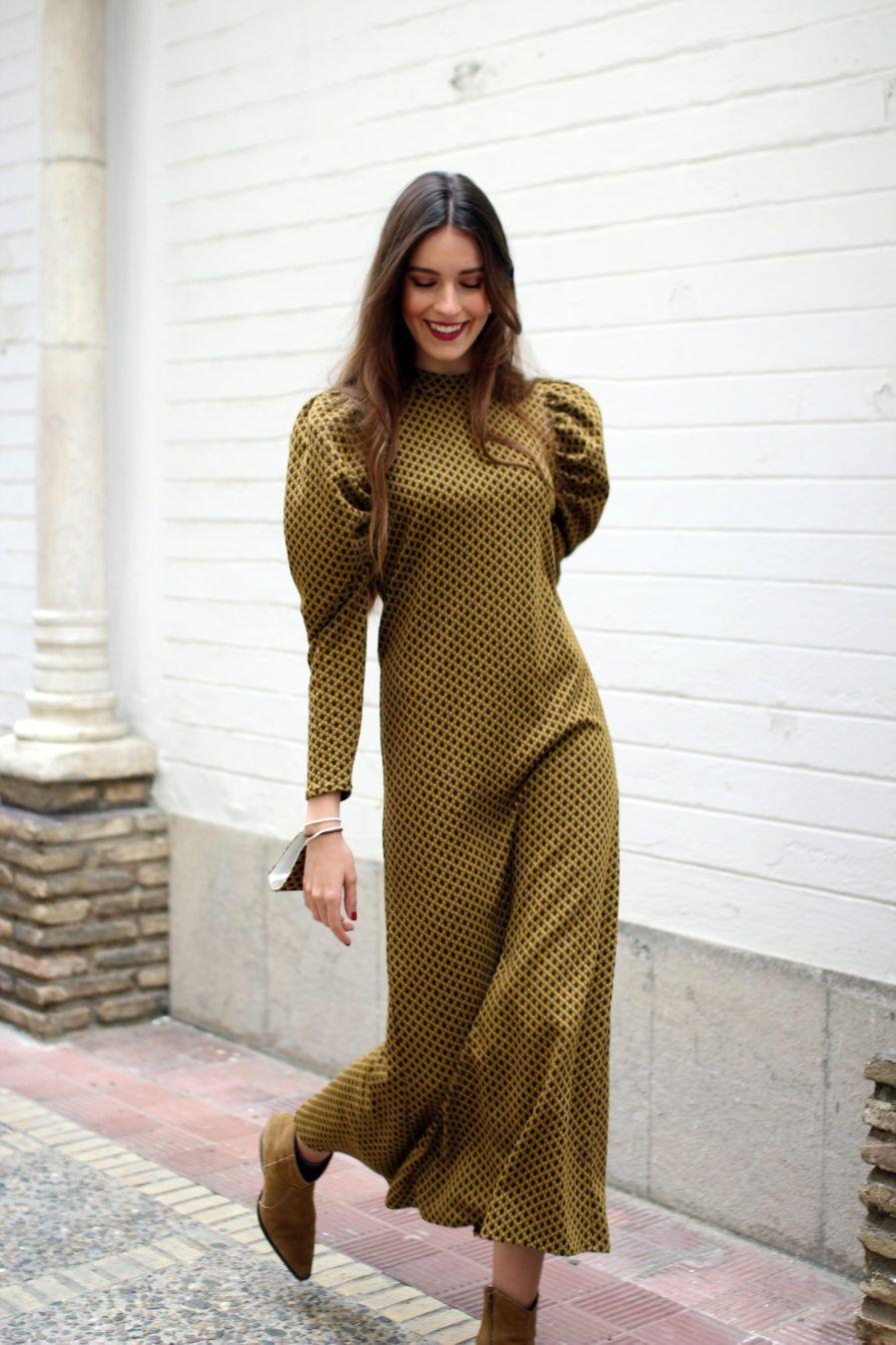 Hemos visto en las redes sociales de su diseñadora un vestido que nos ha llamado especialmente la atención. De corte midi, confeccionado en punto estampado, mangas largas con hombros abullonados, cuello perkins y cierre trasero con lazada.