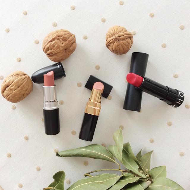 Labiales de diario: Efectivamente así son y aquí están los que uso. Uno en nude, otro más tirando a rosa clarito sin apreciarse un rosa intenso que pueda quedar “ñoño” eso me horroriza y uno rojo de Sephora con el que estoy encantada y es para mis días en los que me quiero sentir más “cañona”. El primero es de Mac Kinda Sexy, el segundo de Chanel y lo siento pero se me borró el número si queréis ir con la foto si os gusta darán con él enseguida.