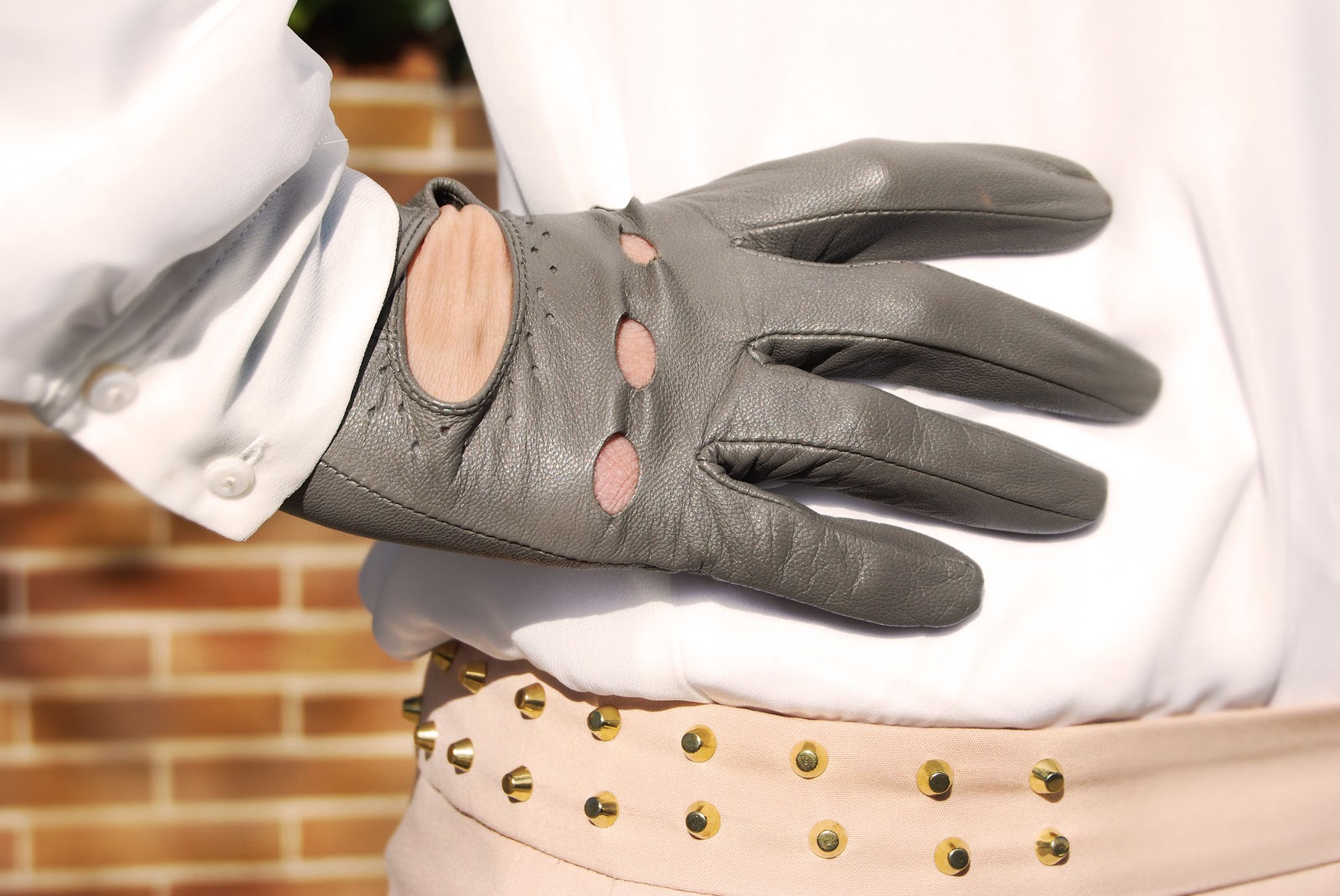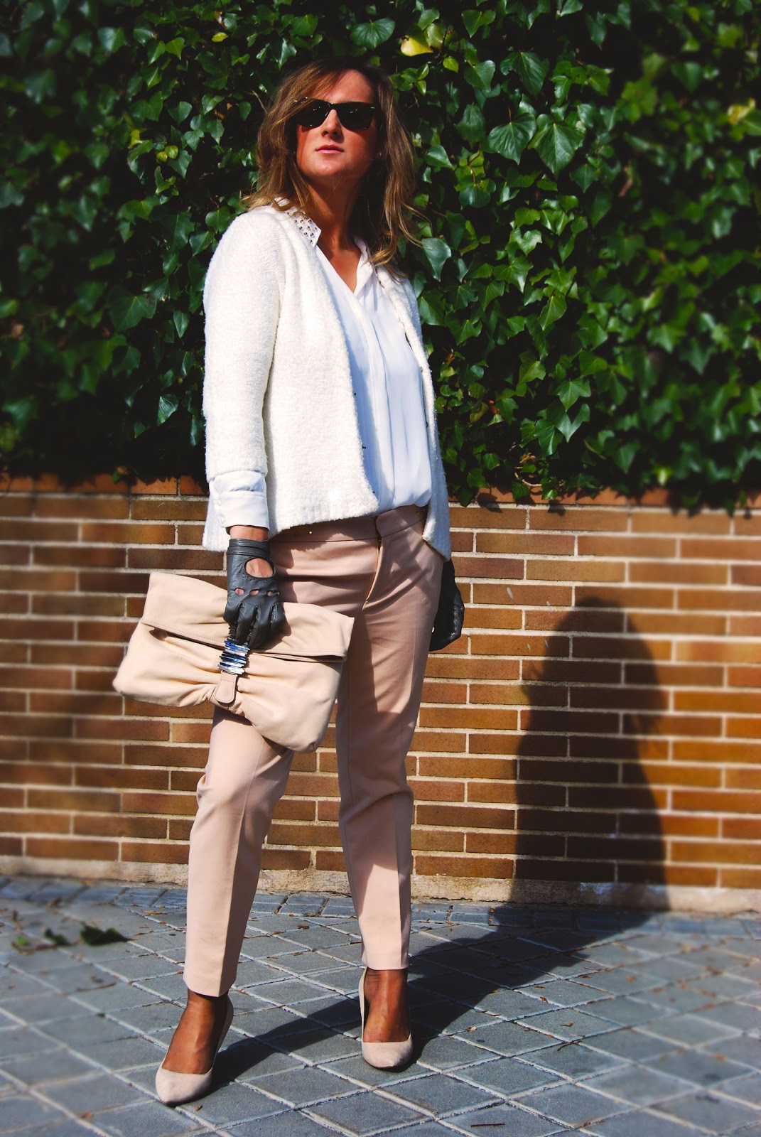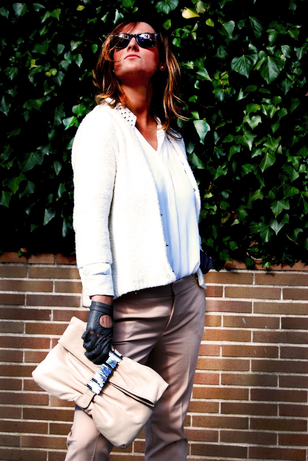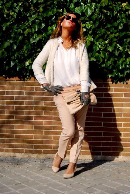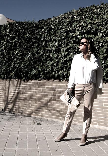 Chaqueta, camisa con tachas y pantalón (una ganga de las rebajas) de Zara. Cartera de Uterqüe , gafas de Ray-Ban, guantes vintage y zapatos de ante de Mango Touch.