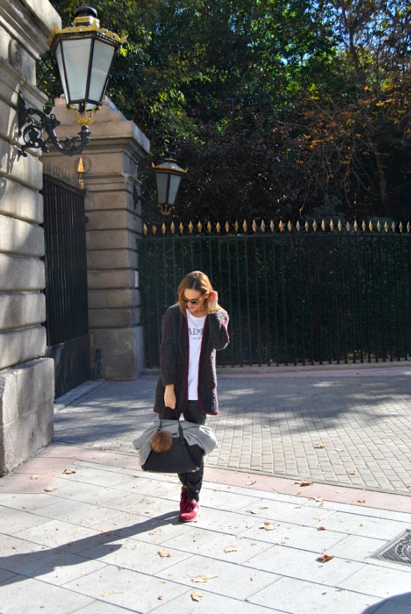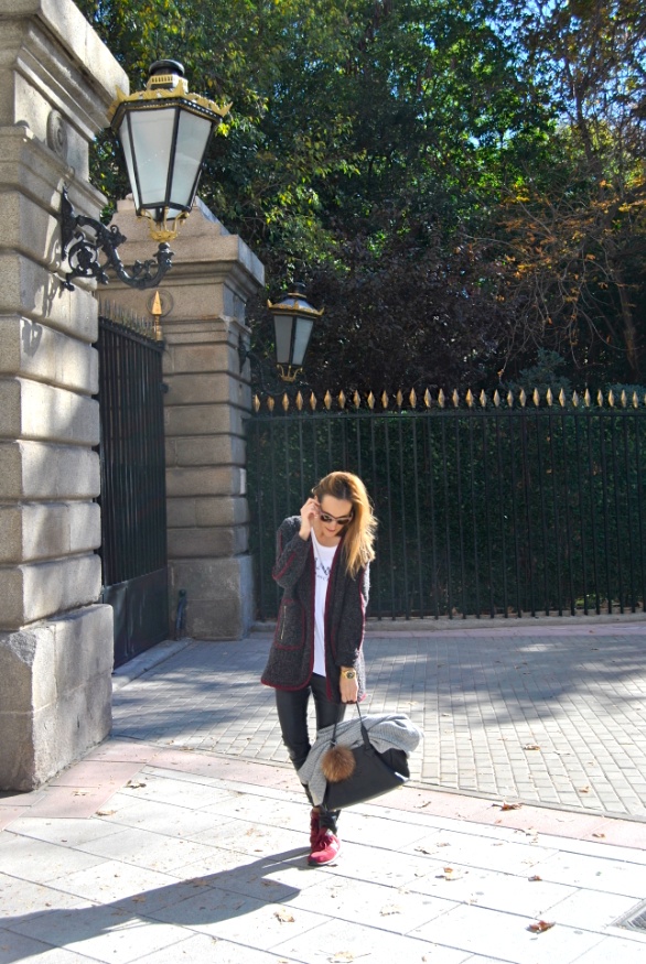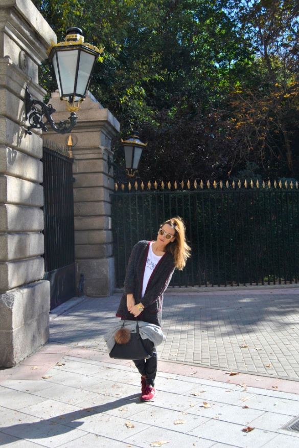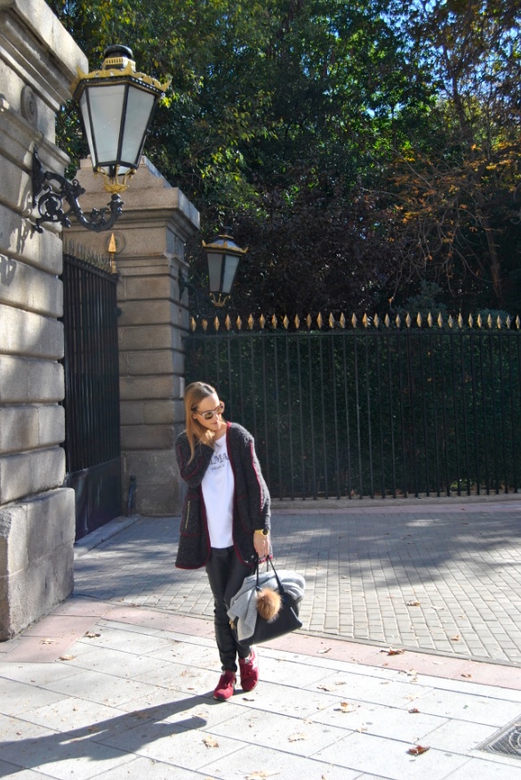 En fin, que referente al look de hoy decir que iba de camino a una reunión en la zona de Princesa, no sabía dónde hacerme las fotos y me dijeron ¿Y en el Palacio de Liria? Me encantó la idea. Me apasiona ese sitio. Hace unos años preguntamos con una amiga si se podía visitar, nos dijeron que tenía una lista de espera de dos años. No sé cómo estará el tema ahora porque han cambiado mucho las cosas pero vamos… si no sé ni que tengo en la agenda mañana, como voy a tener en cuenta una fecha tan lejana. Soy la típica que o se le pasa y me pilla en la otra punta del mundo. Es todo por hoy… Llevo pantalones de cuero de Zara (maravillosos y súper calentitos por dentro que los han hecho este año) camiseta de Balmain, chaqueta- abrigo de Teria Yabar, bufanda que me compré en el Rastrillo Nuevo Futuro (A punto de abrir sus puertas en Madrid) Reloj Aristocrazy, gafas Uterque, bolso Loewe y pompón que me lo compré en una peletería de Zaragoza que perdonadme pero ni idea de cómo se llama la tienda, sólo sé que es mi pompón favorito. Mil besos en el corazón, mañana más.
