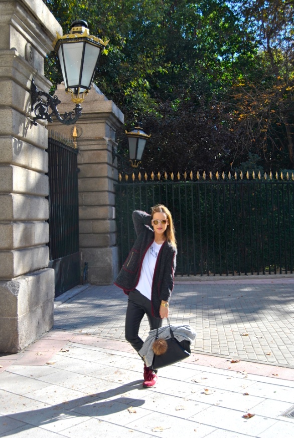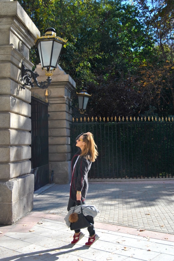 En fin, que referente al look de hoy decir que iba de camino a una reunión en la zona de Princesa, no sabía dónde hacerme las fotos y me dijeron ¿Y en el Palacio de Liria? Me encantó la idea. Me apasiona ese sitio. Hace unos años preguntamos con una amiga si se podía visitar, nos dijeron que tenía una lista de espera de dos años. No sé cómo estará el tema ahora porque han cambiado mucho las cosas pero vamos… si no sé ni que tengo en la agenda mañana, como voy a tener en cuenta una fecha tan lejana. Soy la típica que o se le pasa y me pilla en la otra punta del mundo. Es todo por hoy… Llevo pantalones de cuero de Zara (maravillosos y súper calentitos por dentro que los han hecho este año) camiseta de Balmain, chaqueta- abrigo de Teria Yabar, bufanda que me compré en el Rastrillo Nuevo Futuro (A punto de abrir sus puertas en Madrid) Reloj Aristocrazy, gafas Uterque, bolso Loewe y pompón que me lo compré en una peletería de Zaragoza que perdonadme pero ni idea de cómo se llama la tienda, sólo sé que es mi pompón favorito. Mil besos en el corazón, mañana más.