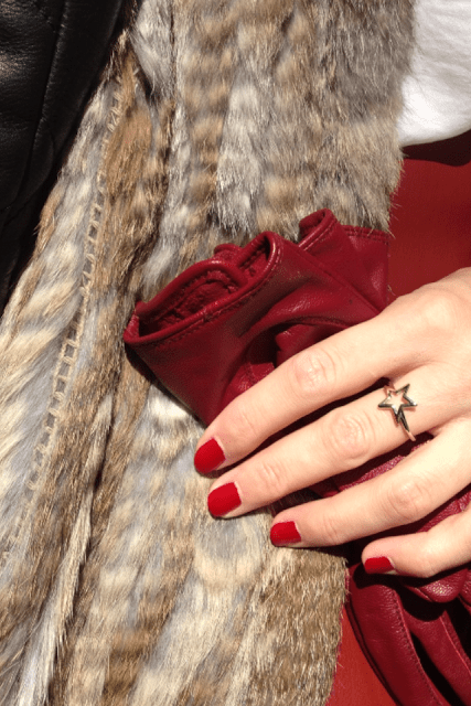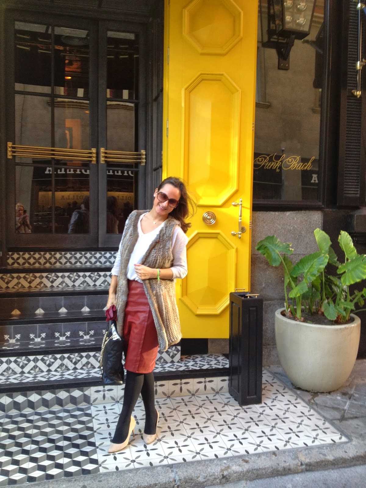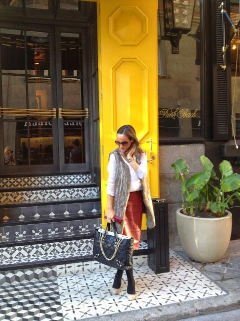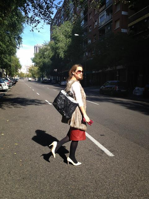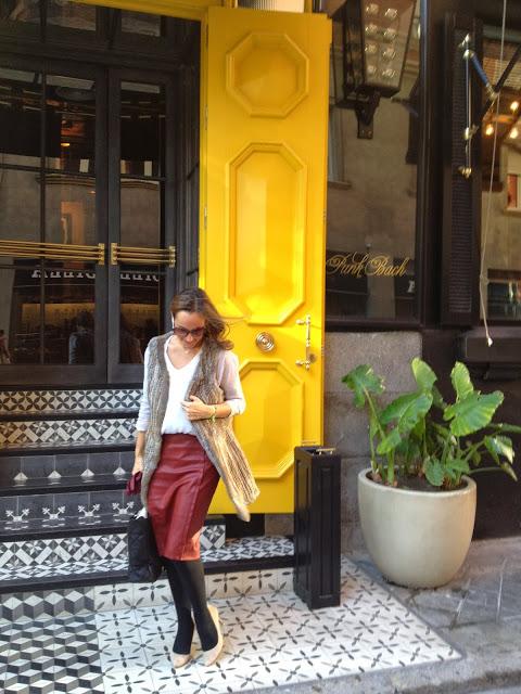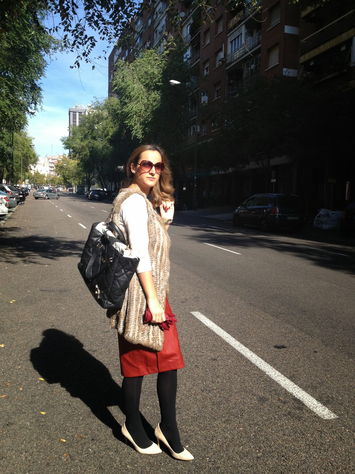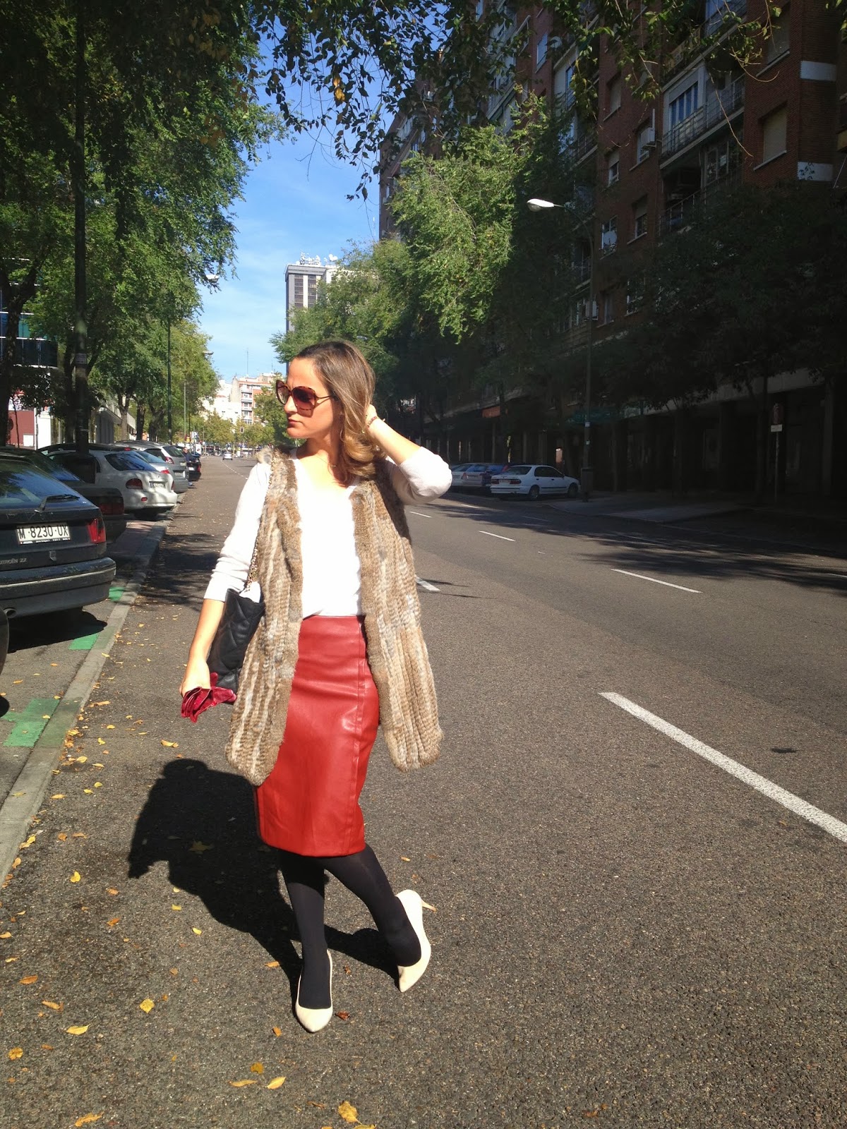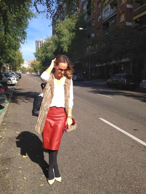 Para la ocasión elegí un look con falda tubo en granate de piel de Zara, camisa de Massimo Dutti, chaleco de Sita Murt, anillo Bimba y Lola, zapatos (¡NO son blancos! Son beig pero se ven algo quemados…) gafas Mango Touch y bolso VMB. Manicura Le Petit Salon.