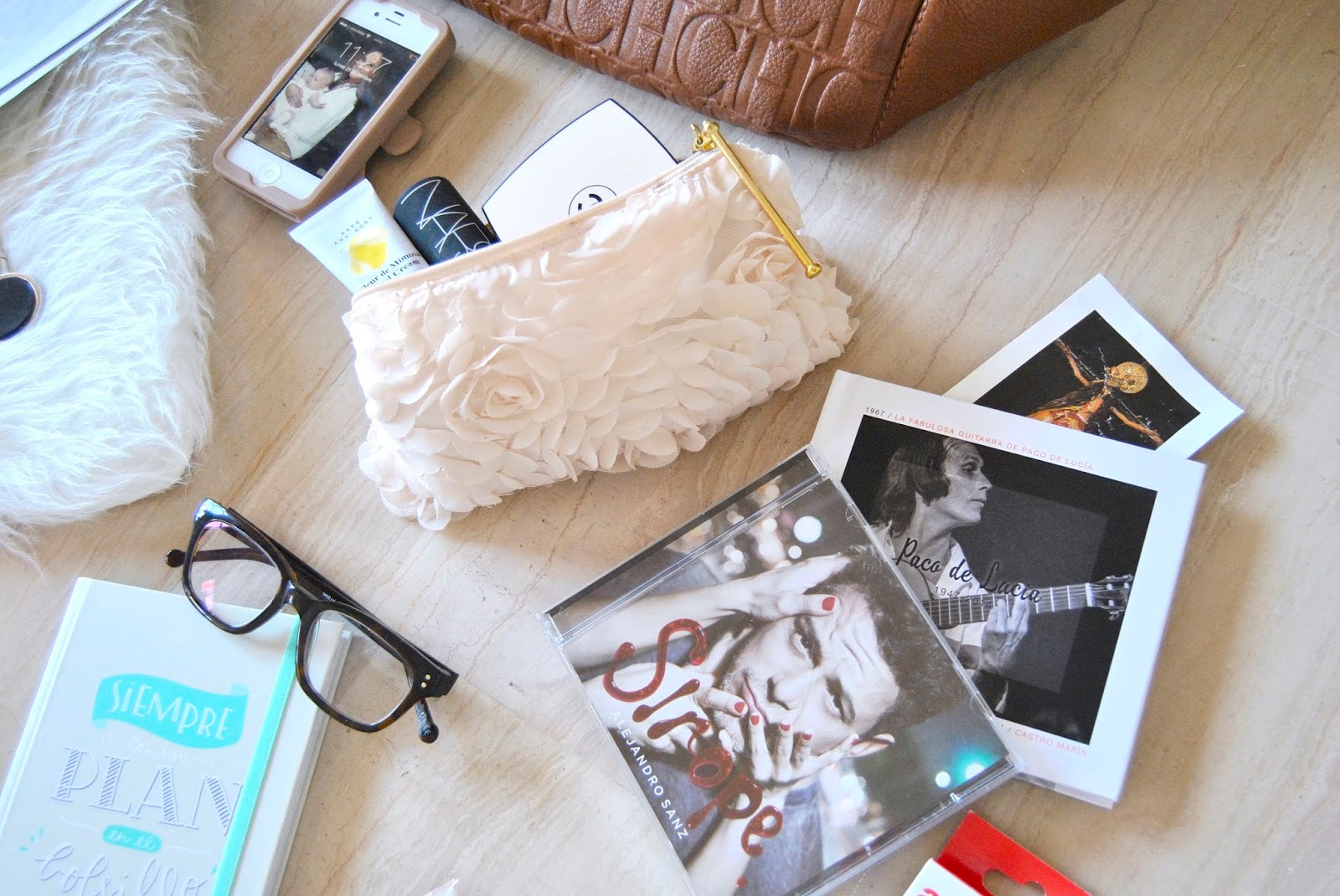 ¿Qué más? Pues unos buenos discos para cuando me subo al coche… Esta vez uno de Paco de Lucía y Alejandro Sanz ¡Ah! Y mi estampa del Santo Cristo de los Milagros, a ver si hace uno y no deja que se me rompa el asa del bolso. Que por cierto para colgarlo tomando una copa el cuelga bolsos que es esa especie de gancho es maravilloso. Mil besos en el corazón, mañana más ¿Y tú? ¿Qué llevas en el bolso? Cuéntamelo en las redes… te espero. (Por cierto y aclaración… el texto últimamente está rebelde, el día que no le da por cambiar el tamaño de la letra cambia el alineado del texto… contra la tecnología no se puede luchar, bendito lápiz y papel… qué cruz)