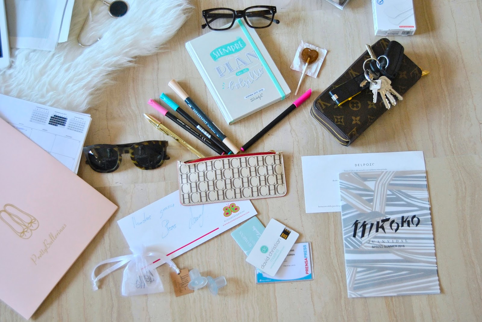 En fin que como os decía eso es lo que llevo de más cuando voy a algún evento… De normal pues ya lo veis, os lo describo un poquito. El móvil y el Ipad indispensables, son una prolongación de mí. Últimamente la tablet la llevo a todas partes para hacer fotos, escribir alguna nota rápida… El neceser, para de vez en cuando darse un retoque sobre todo si tienes alguna sesión de fotos y llevas ya la raya en los pies. Gafas de ver y de sol. Sin funda sí. Porque habría que darles un premio a las que la llevan. La cartera, las llaves, la agenda, un dulce como una piruleta de coca cola (más para los peques de mis amigas que para mi) Aunque cuando me entra el gusanillo de tantas horas por la calle no la comparto. Luego también encontraréis dossieres de prensa, pen drives de colecciones, alguna acreditación de alguna pasarela de ese momento, invitaciones o tarjetones de agradecimiento.