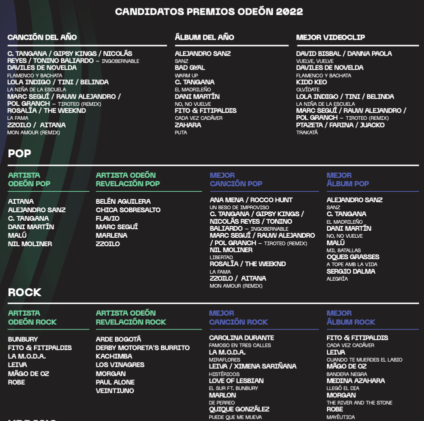 CATEGORÍAS PREMIOS ODEÓN 2022