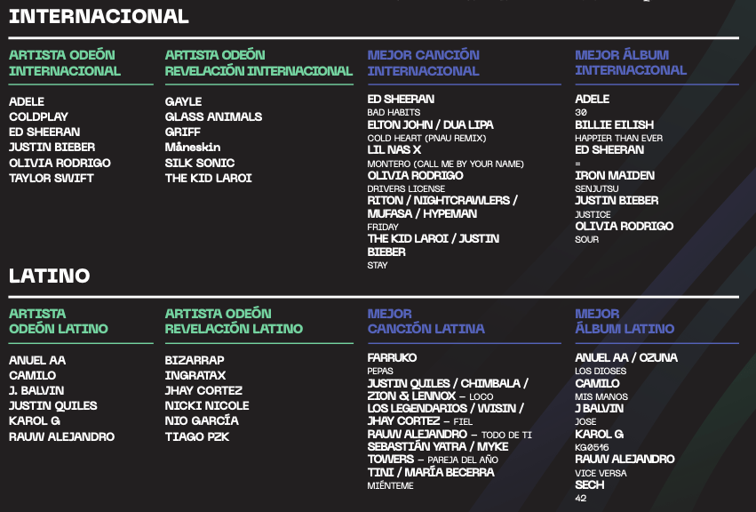 Los Premios Odeón están impulsados por AGEDI (la entidad de gestión de derechos de la propiedad intelectual de los productores fonográficos) y reconocerán a los artistas y grabaciones más destacadas de 2021.